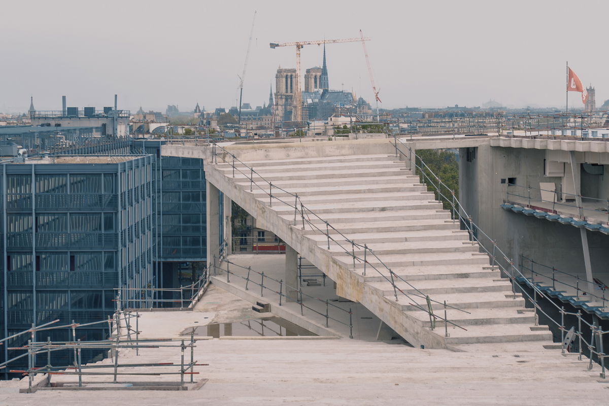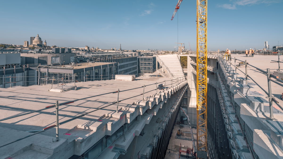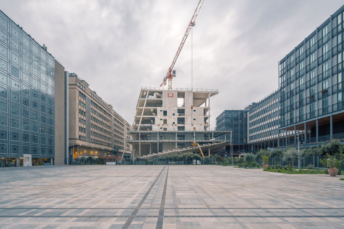 Cité de l’innovation Sorbonne Université — The open space of the atrium and the public accessible recreational rooftop relinks the park and the square in a continuous green axis, following the original intensions of the masterplan.