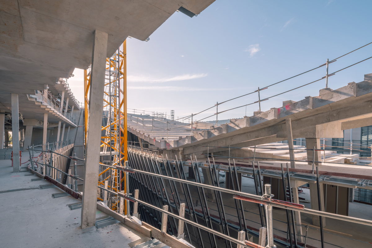 Inclined roof — The fifth façade of the building envelope, the roof, is inclined to connect the building heights of the Cassian Building and the Albert Grid.