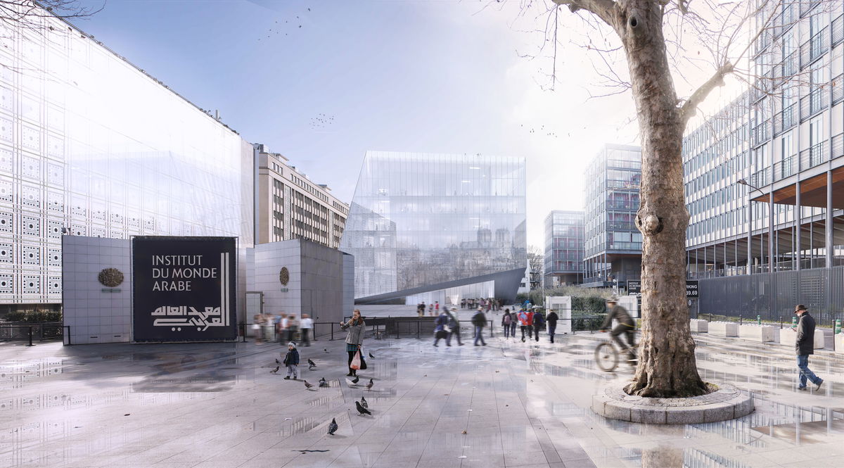 Deformation towards Notre Dame — The façade facing the square is angled 5 degrees, creating a mirror image of the skyline of Paris and the Notre Dame visible from the IMA square.