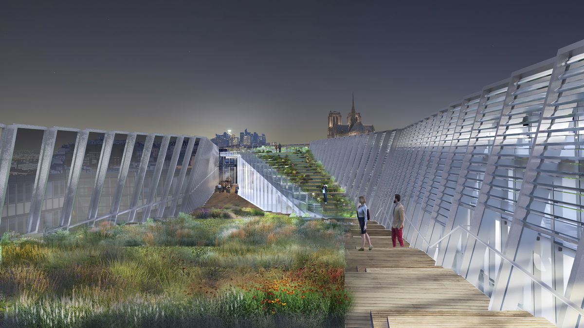 daylight & views — Deformed by the pressure of the surrounding buildings, the resulting volume is wedged into the dense context, and avoids blocking the views of the green axis. The envelope creates sculptural passages with views of the park and Notre Dame Cathedral.