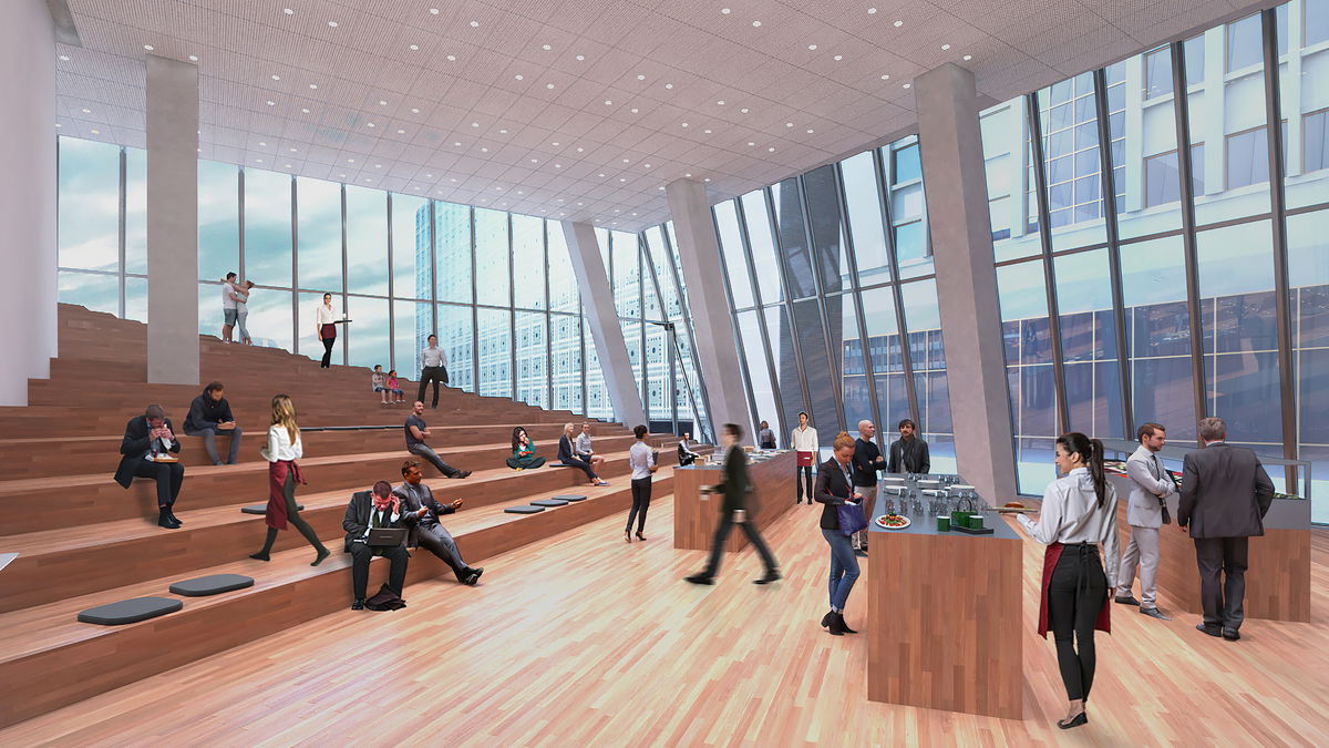 The fifth façade of the building envelope, the roof, is inclined to connect the building heights of the Cassian Building and the Albert Grid. — The building envelope is pushed in to keep the distance towards the apartments in the Albert Grid. Improving the daylight and view conditions for both apartments and offices.