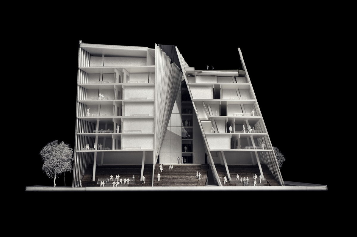Context — A dense site between the famous Albert Grid the Cassan building and the Institute Monde Arabe. The site connects IMA square to the park, and fills the space of the originally planned green axis of the Jussieu Campus.
