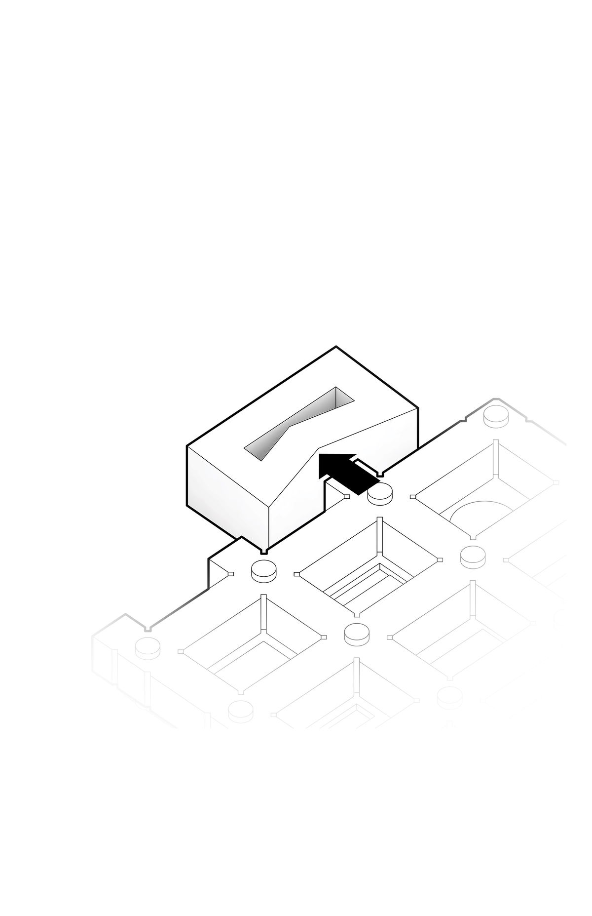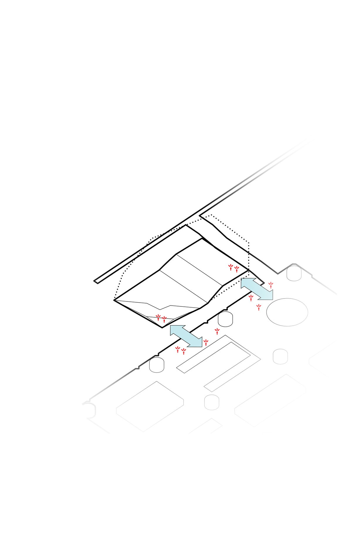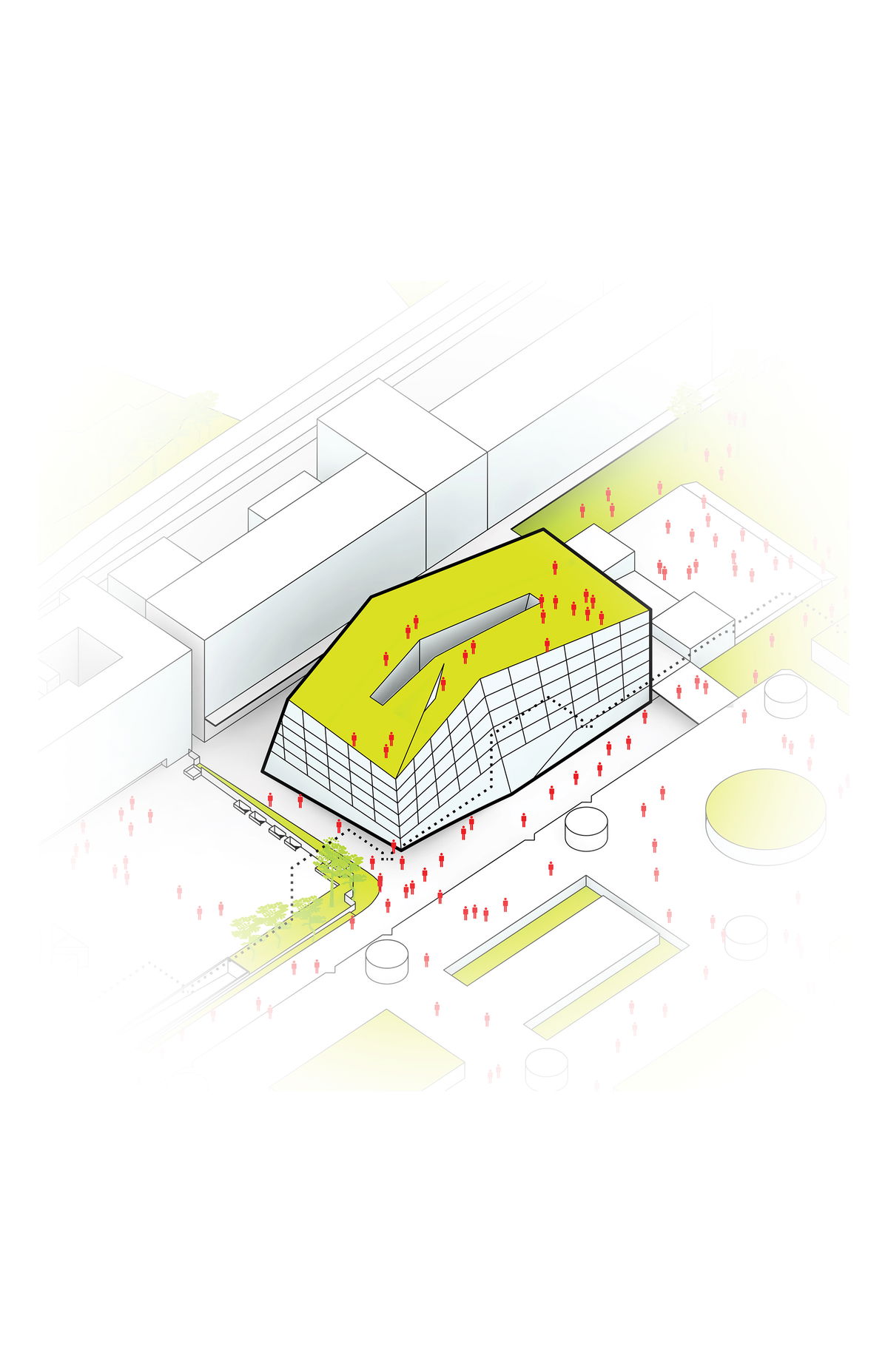 Folded ground floor — The public ground floor containing the café, the book store and the conference facilities, becomes a folded carpet connecting the different height levels of the park, the plinth, and the square.