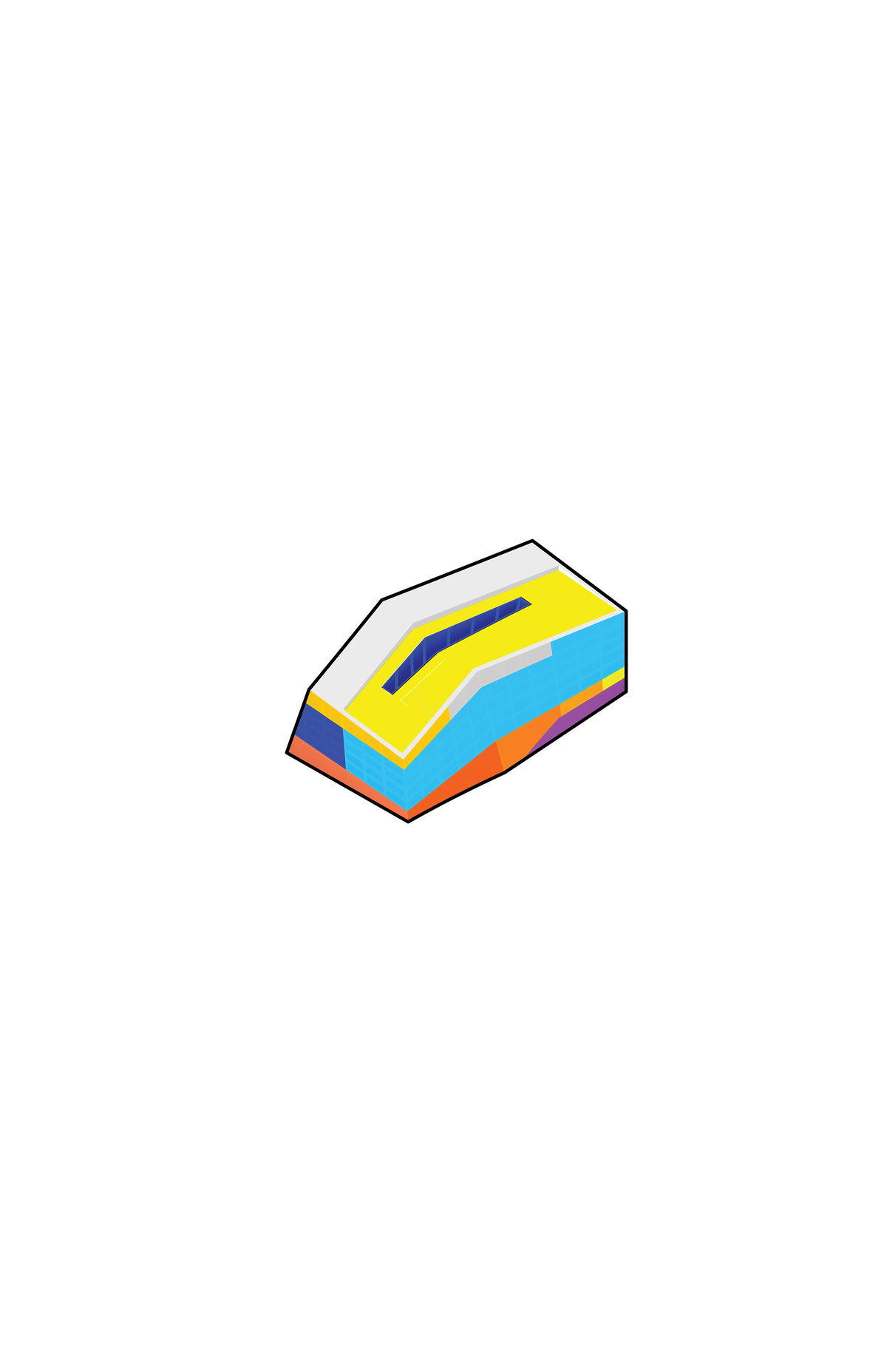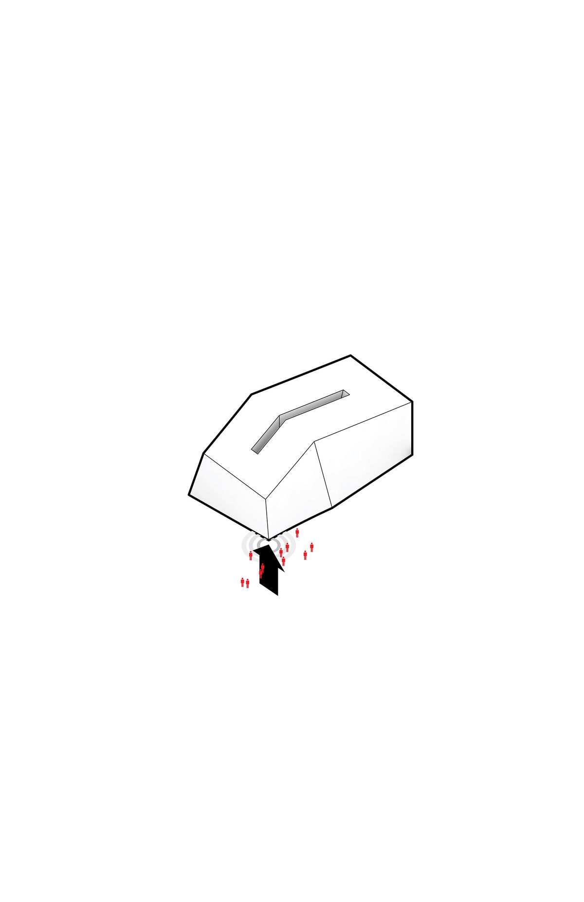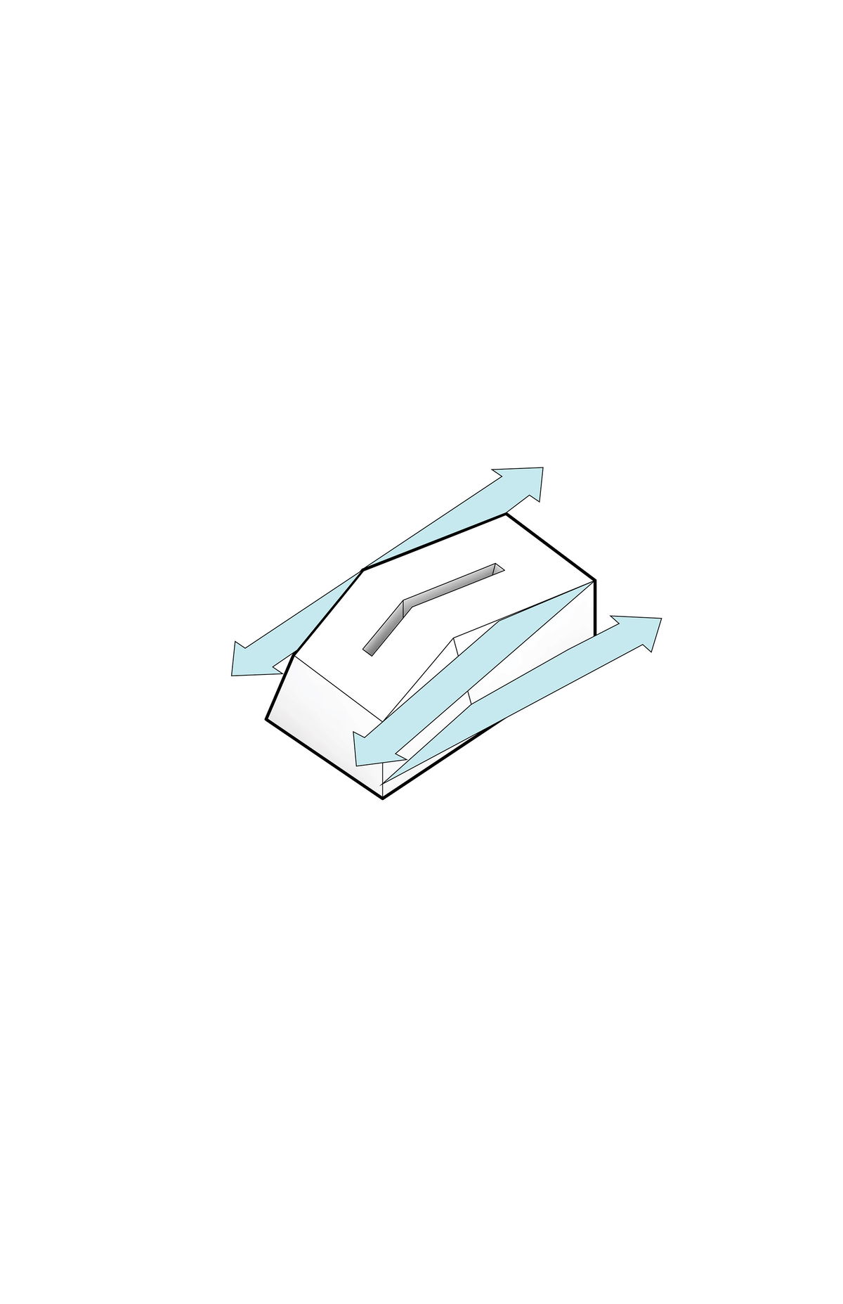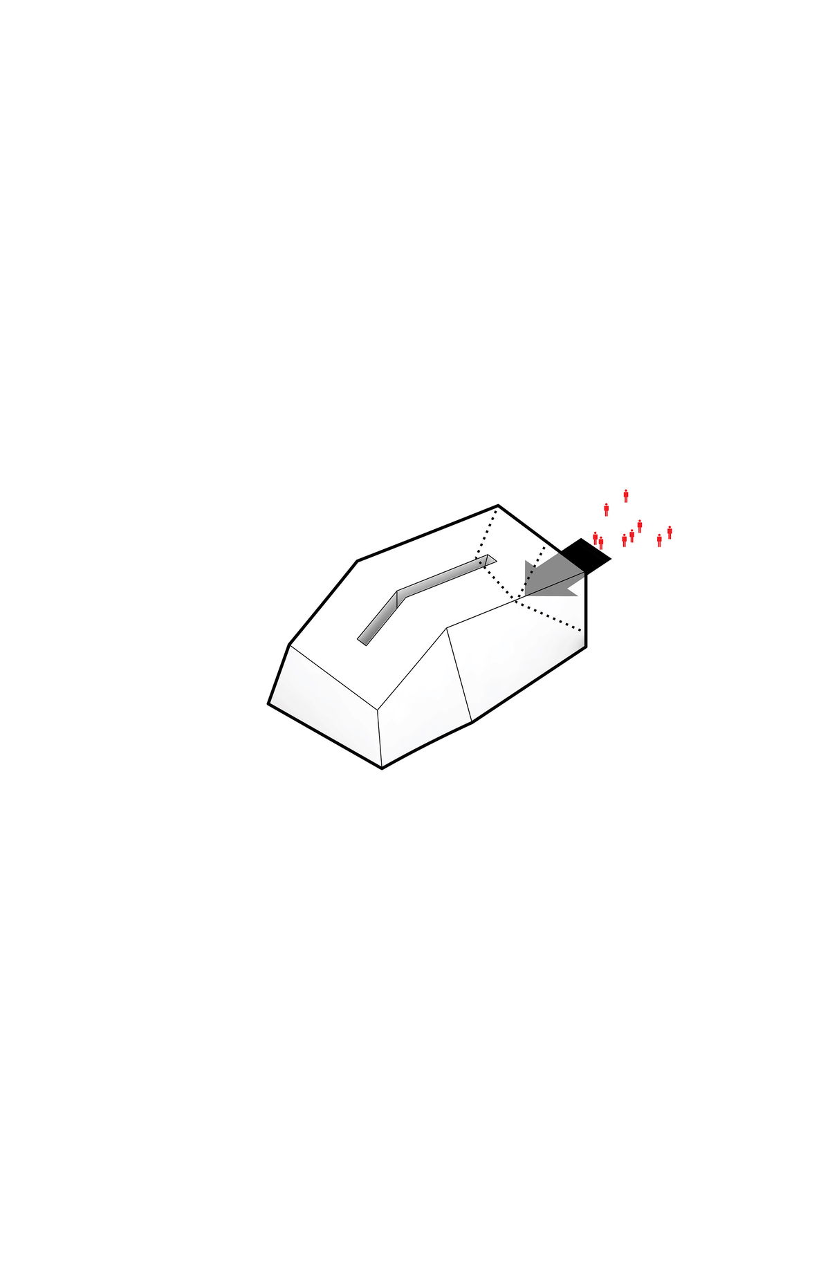 Folded ground floor — The public ground floor containing the café, the book store and the conference facilities, becomes a folded carpet connecting the different height levels of the park, the plinth, and the square.