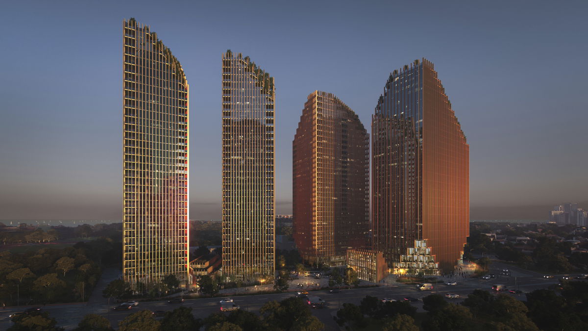 5 TOWERS — The program is divided between five towers and four podium buildings. Each residential building has 9 floors of premium residential, 22 floors of residential, and amenities and lobbies at the top and bottom. The mixed use building has 11 office floors, and 15 hotel floors. Two of the podium buildings are shared lobbies and two are full retail podiums.