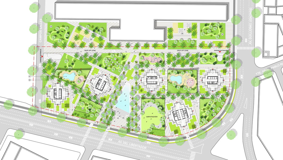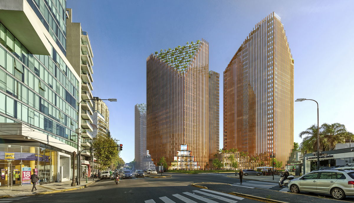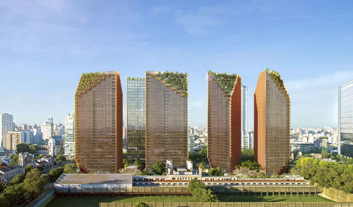 HABIT TOWERS — Together the Habit Towers provide a strong urban realm, and a distinct skyline formed from the stepped green terraces. It is a striking ecological landmark for Buenos Aires.