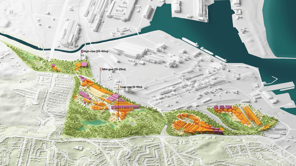 CURRENT SITE CONDITIONS — The masterplan site consists of 200 ha of land between the active industries and surrounding communities, combining industrial buildings and infrastructure, dramatic topography and green zones containing remnants of the original sub-tropical landscape.