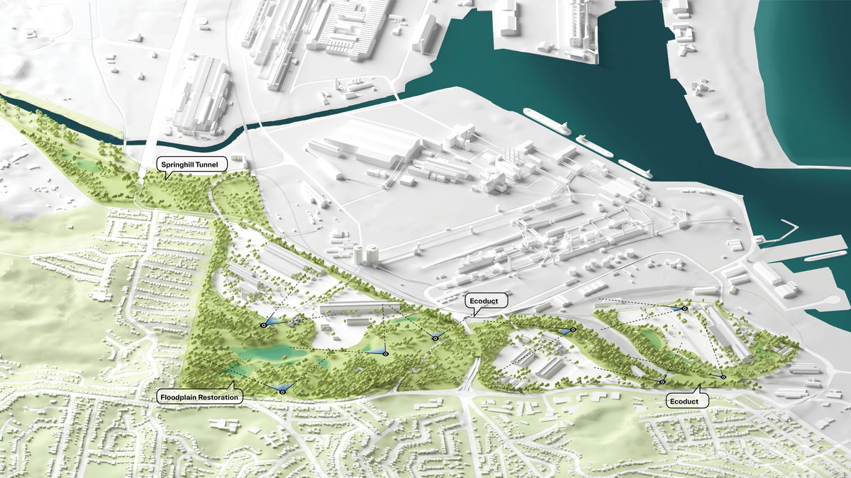 ENHANCEMENT OF ECOLOGICAL CORRIDOR — The ecological corridor on the site will be preserved and enhanced, ensuring that biodiversity is supported and fragmented habitats connected. Ecoducts and future wetlands are integrated to allow for diverse ecologies to thrive.