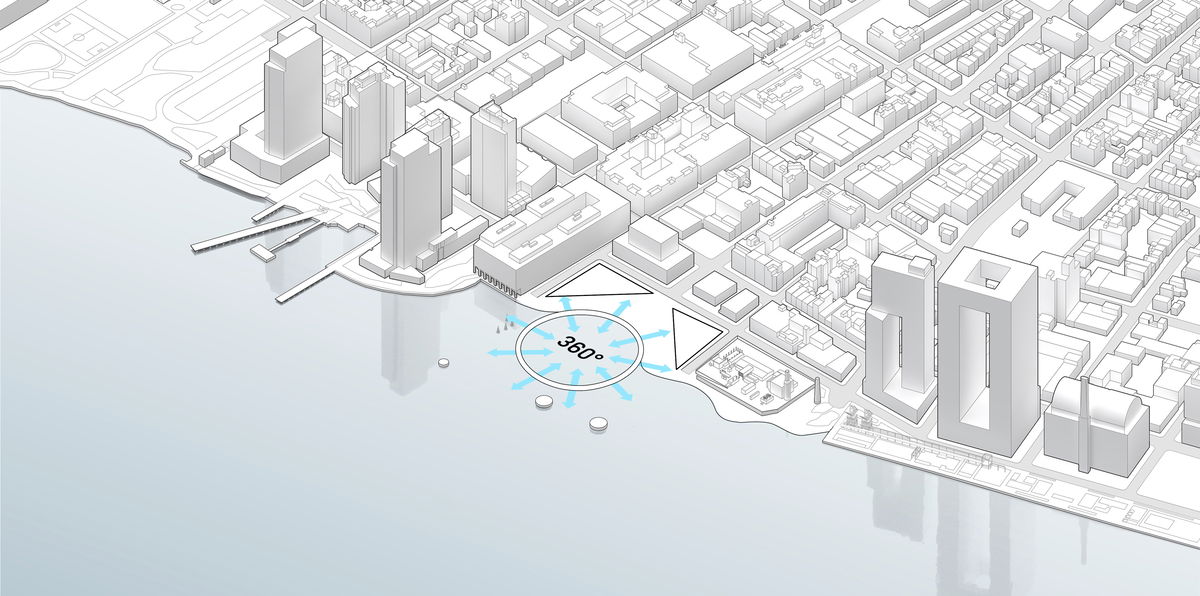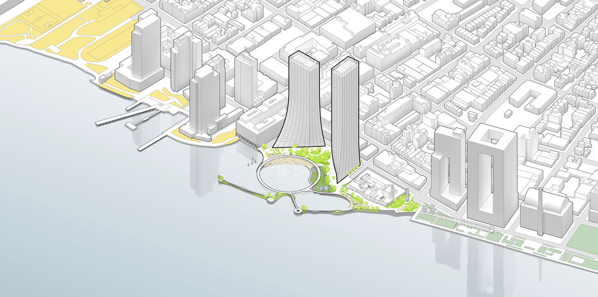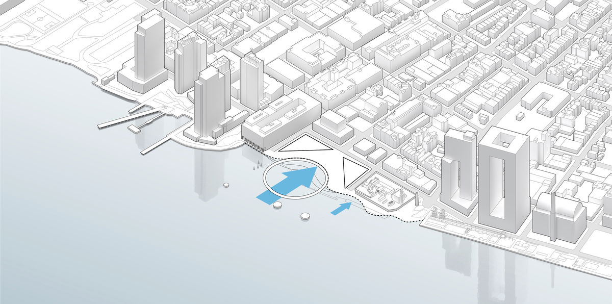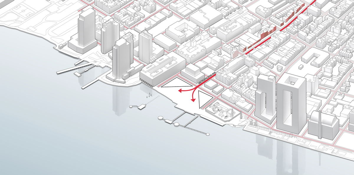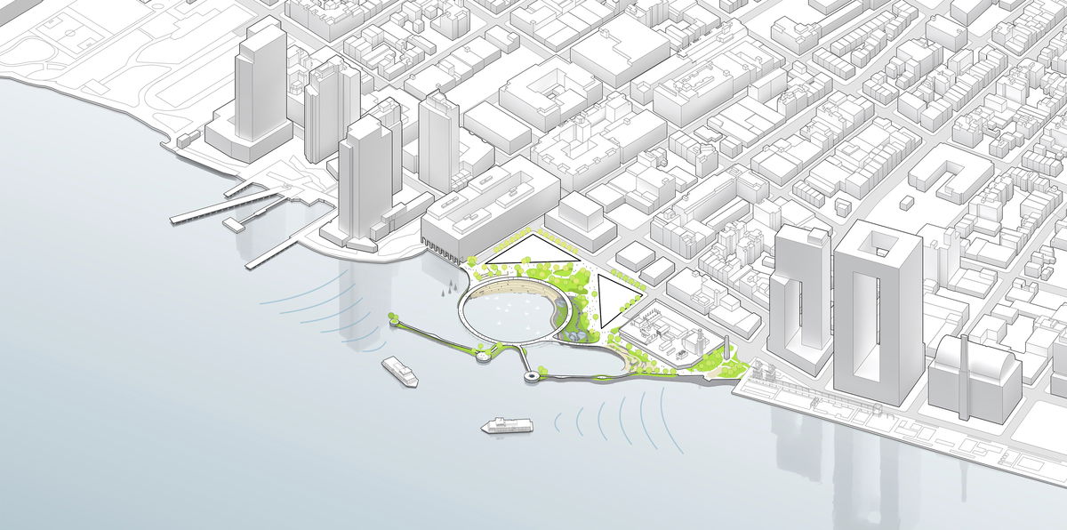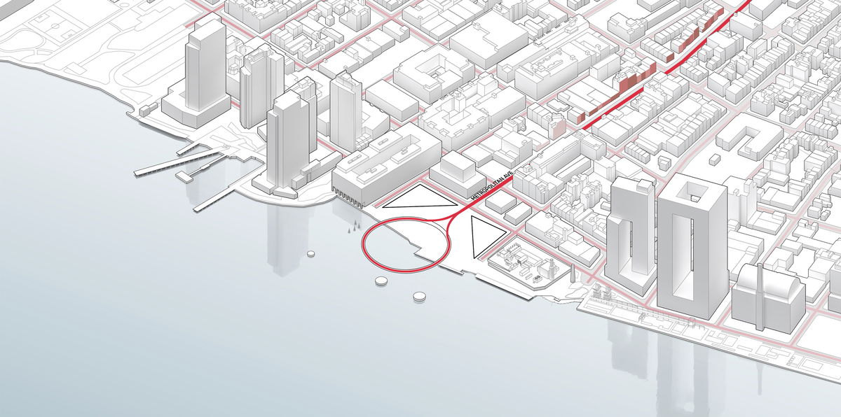“We investigated the opportunity to stretch the Williamsburg waterfront landward with a circular pier and protected cove for water-based activities, inviting New Yorkers to take back and enjoy the river as a social and ecological public amenity. Surrounded by a necklace of recreation, educational and commercial programs, we envision the historic piers to be renewed and teeming with life. The masterplan proposes splitting Metropolitan Avenue into two diagonal pathways that connect to the waterfront promenade, resulting in triangular building footprints with views to the East River. Two towers inspired by Williamsburg warehouses are injected with neighborhood-oriented retail at its base, while the traditional podium is replaced by cascading terraces that frame and soften the relationship to the park.”Daniel Sundlin - Partner, BIG