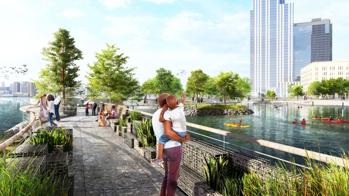 PROTECTIVE BREAKWATERS — Extending landscape-piers to large concrete caissons, once used to anchor large ships, creates protective breakwaters. These dissipate wave action from the river to create calmer waters for in-water recreational activities while adding a level of protection during storms.