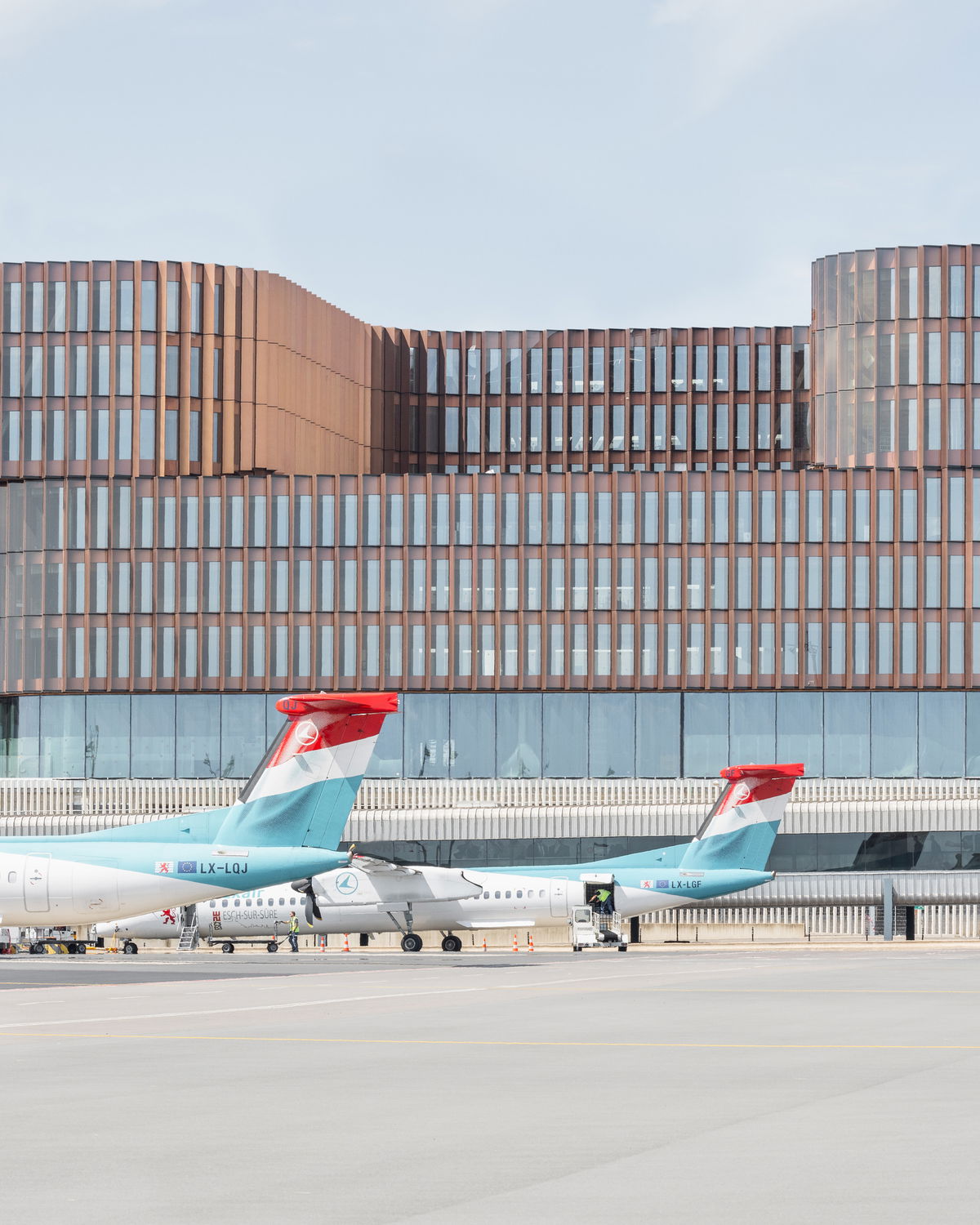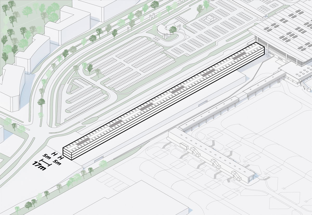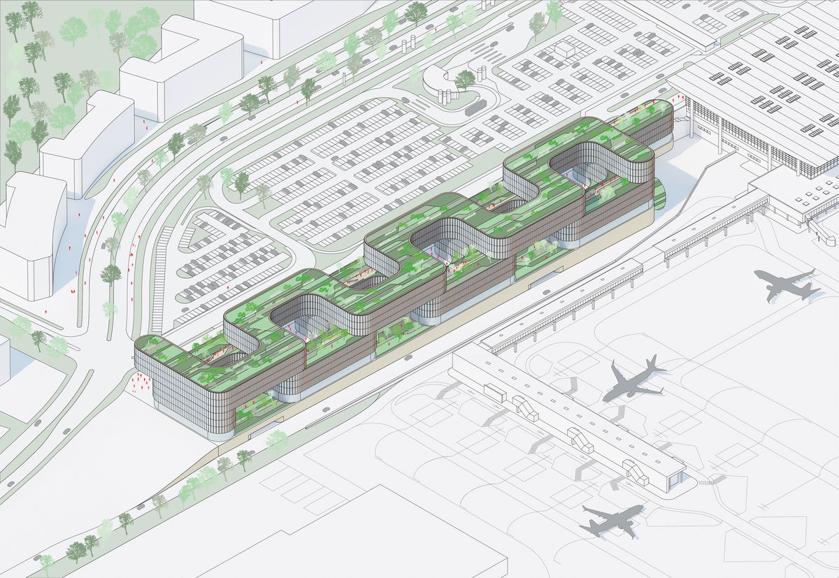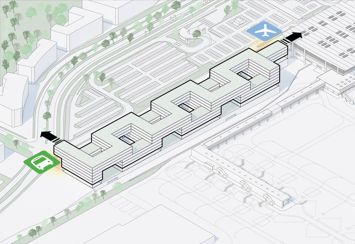 LIFT — The whole building is lifted to create a porous and accessible ground floor level, fully open to the public. Pedestrians and drivers on the road will also have an immediate view towards airport's 4 km long runway.