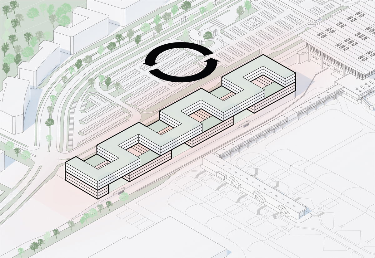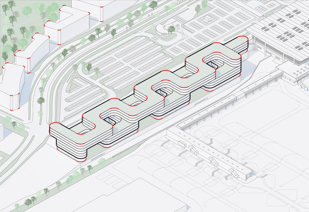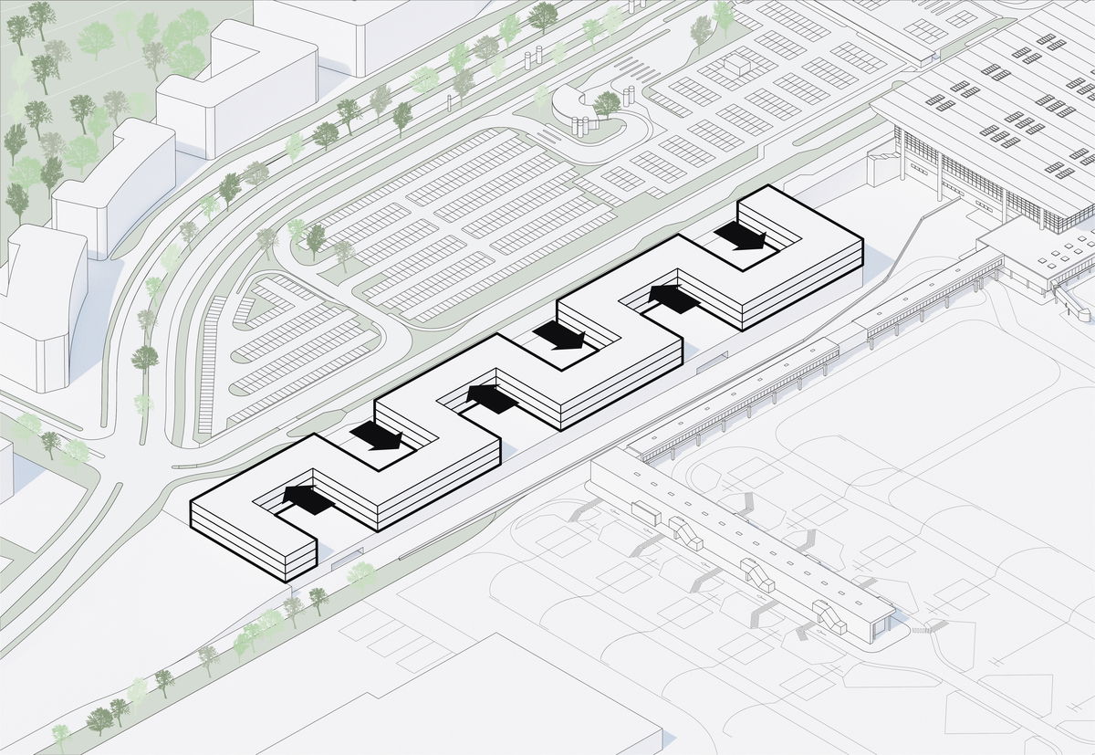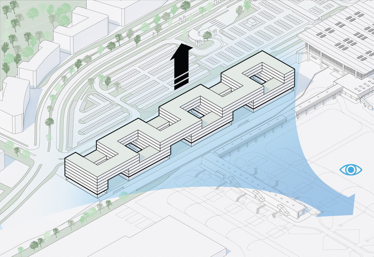 REQUIRED AREA — Rather than a long bar, a 17 m zigzag along the entire length of the site gives more floor area and facades that area naturally lit, fulfilling the brief's requirement of 30,000 m2 across 3 floors.