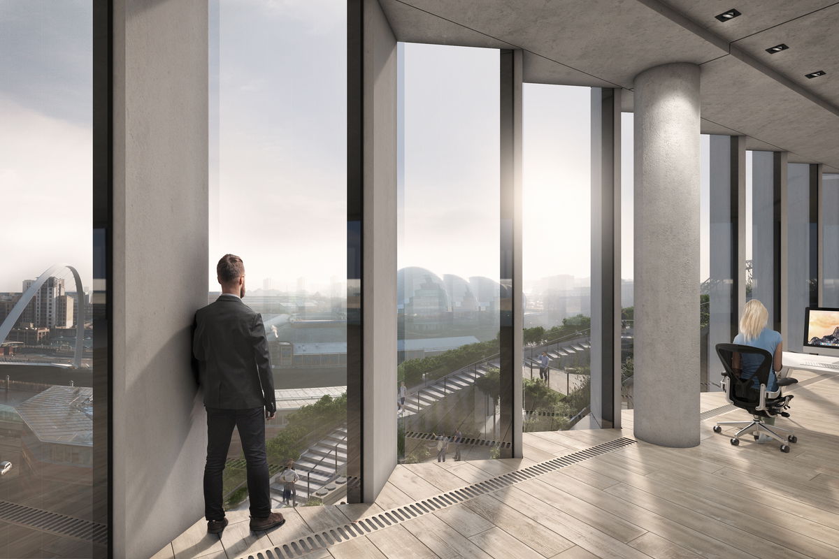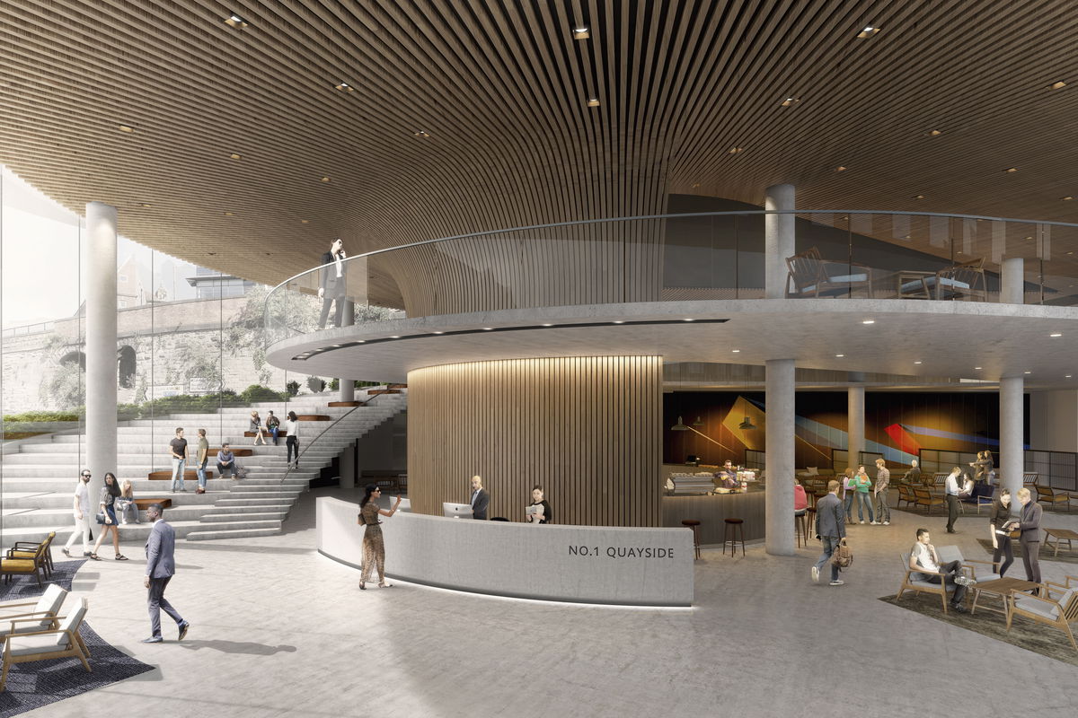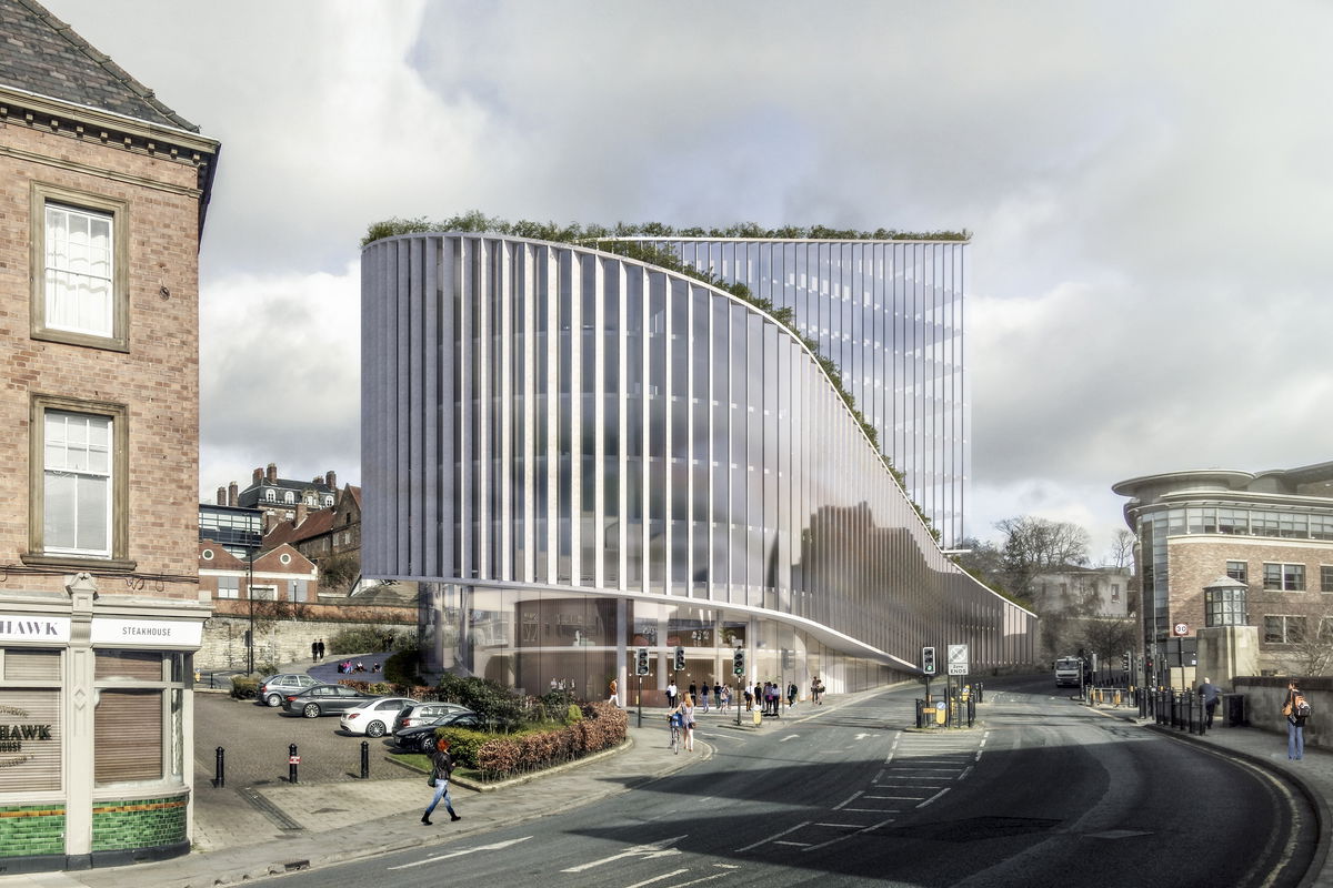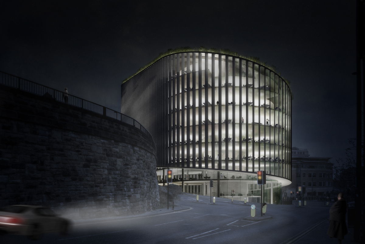 FOLLOW RETAINING WALL — The current site is bordered by a retaining wall that separates Quayside from City Road above. The basic massing follows the curve of the retaining wall as it winds west toward the Tyne.