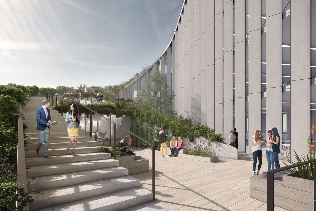 COURTYARD & GREEN ROOF — A string of terraces wind their way down the massing to create a linear green space connected by a stair at the western edge that provides a secondary means of egress from each office floor.