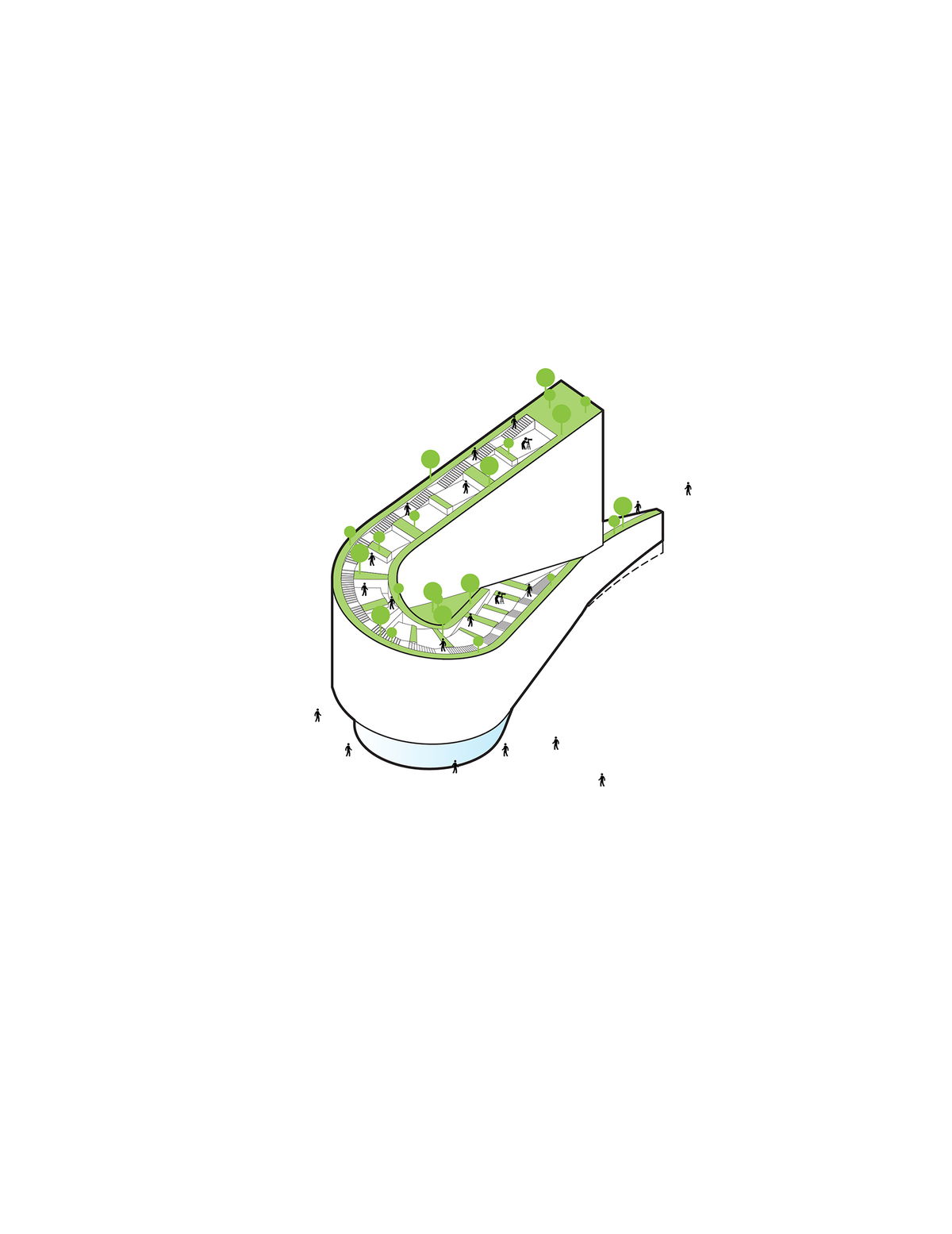 WRAP — Upon reaching the corner of the site the geometry wraps around the natural curve to create a tear-drop shape that follows City Road back around to the west.