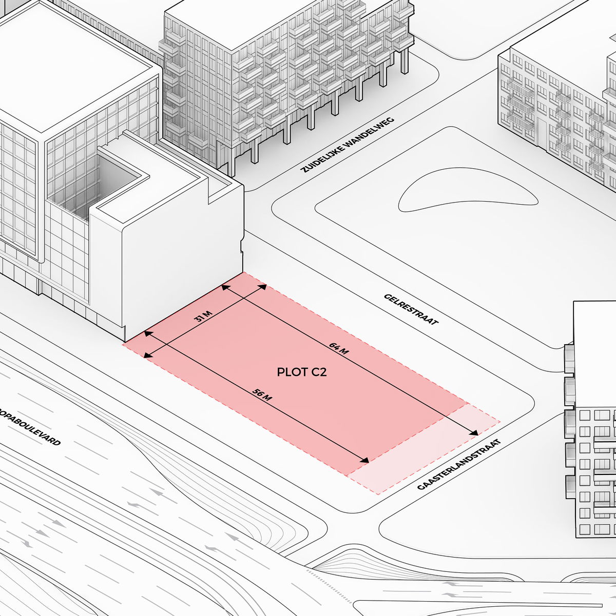 SITE — The 1,985 m2 plot is bordered by a hotel, Europaboulevard street leading to the center of Amsterdam and a park.