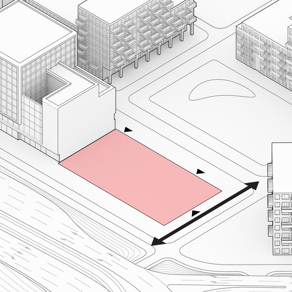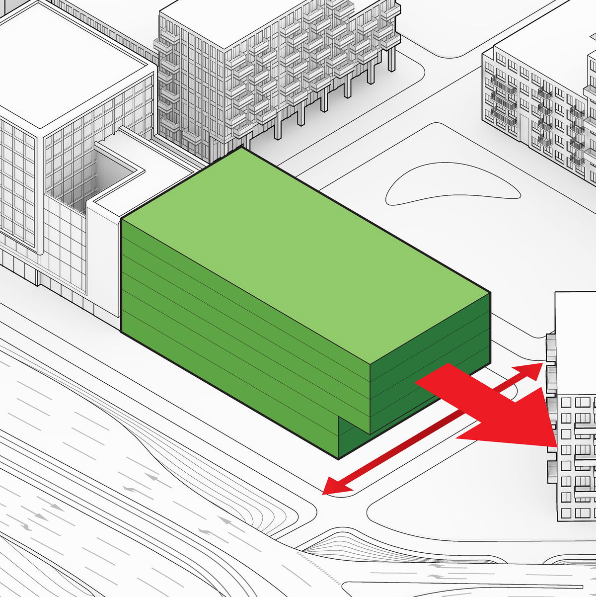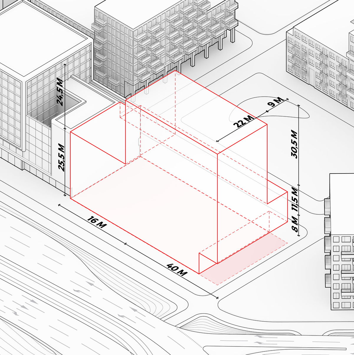 Building Envelope — The site is shaped by a series of urban planning restrictions. The max height to the south is 58 m, while a cantilever of 8 m to the south over the plot boundary is possible.
