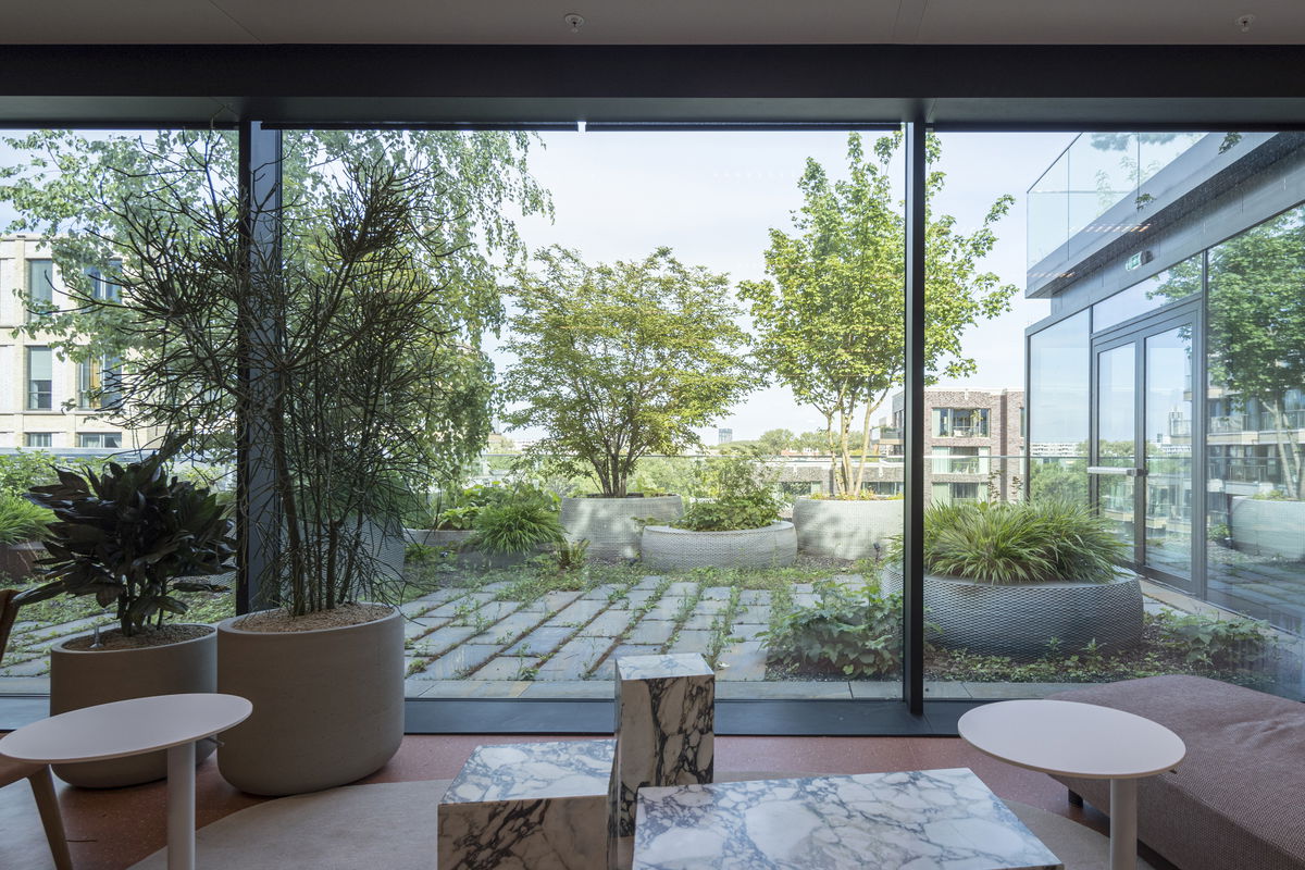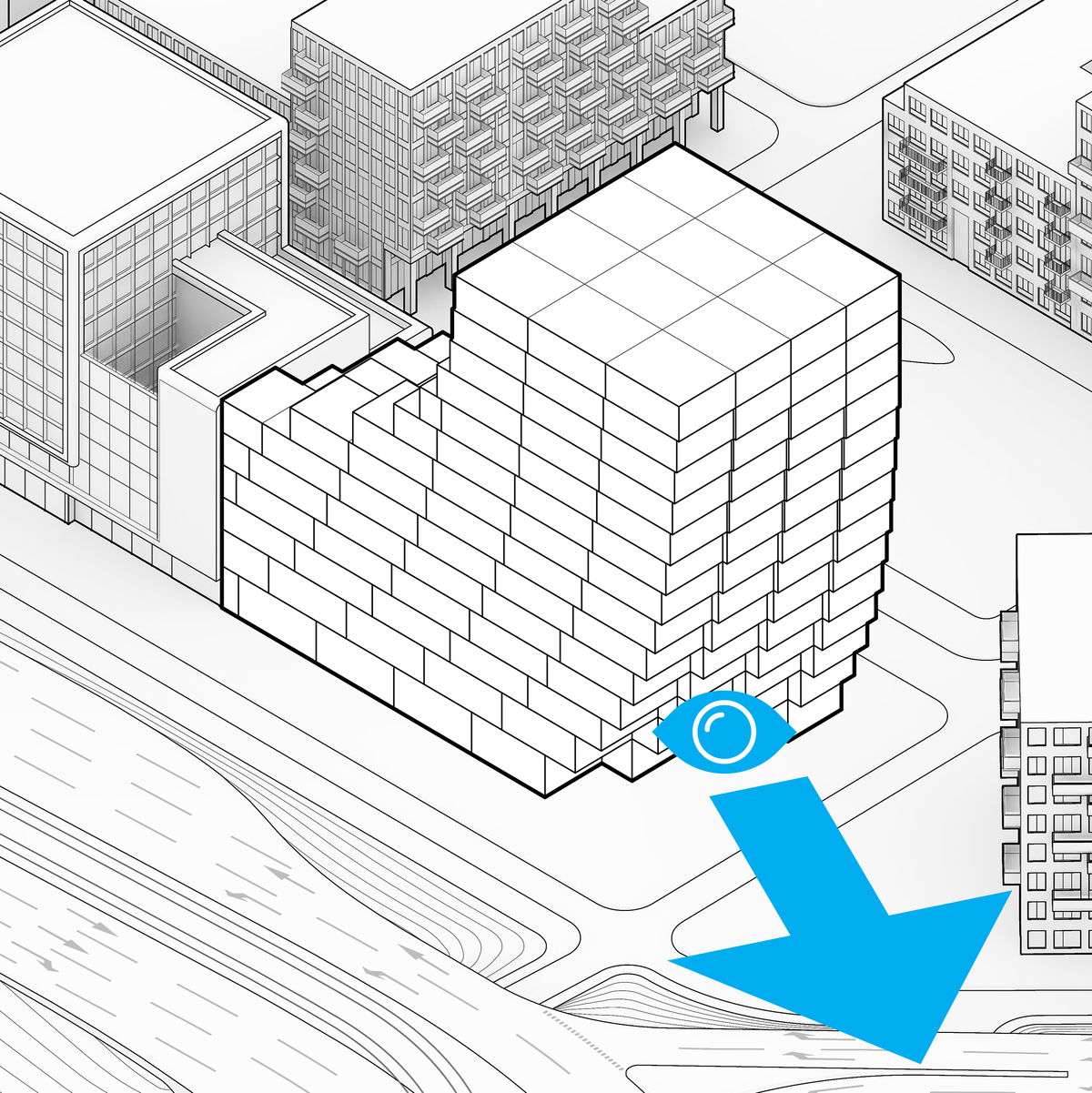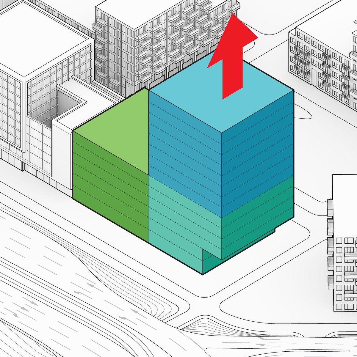 Gradient — To improve and fulfil the desired office daylight requirements, the office floor height is gradually increased towards the plinth to allow for a deeper daylight penetration into the office block levels.