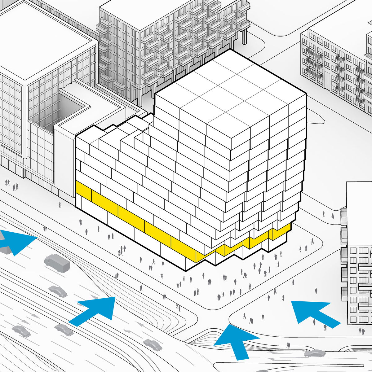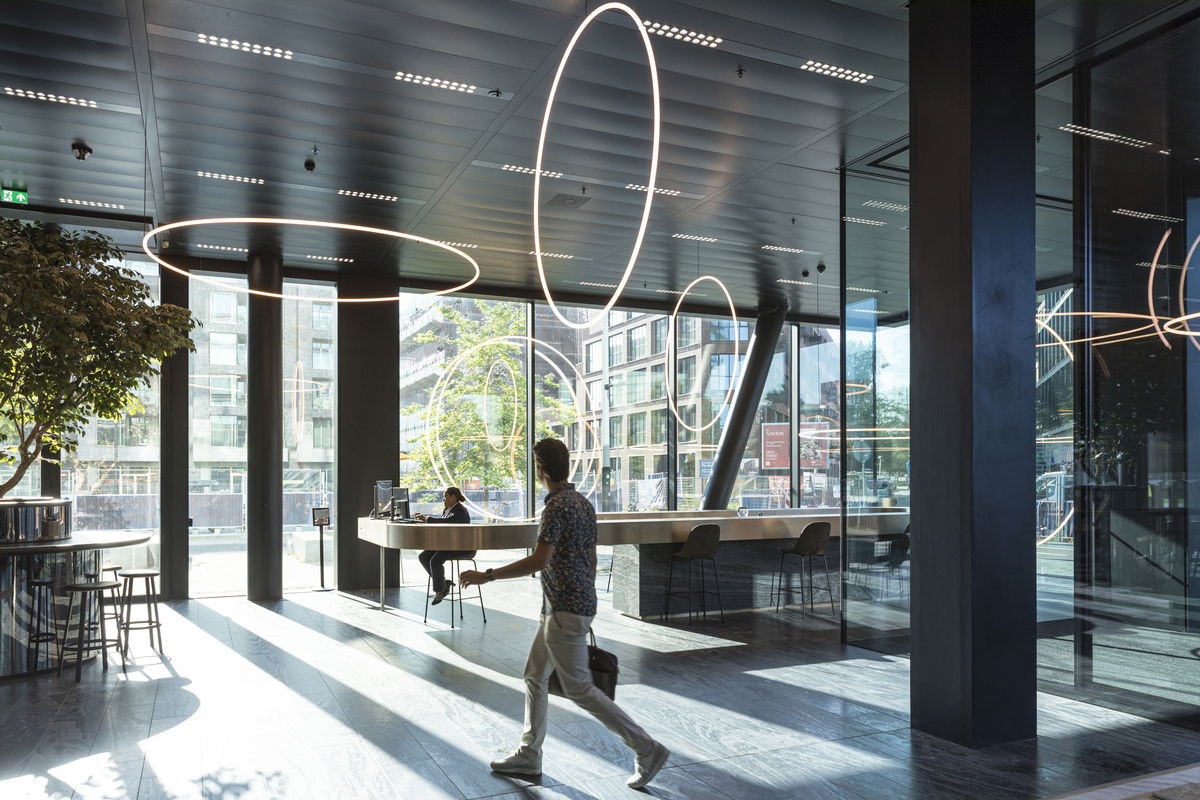 Site Logistics — The main access for employees on foot will be from the public plaza while the plinth café and retail will be accessible through another entrance facing the central green.