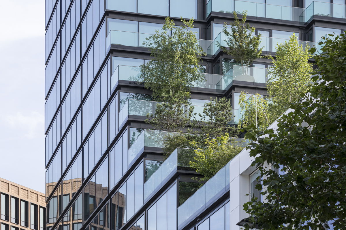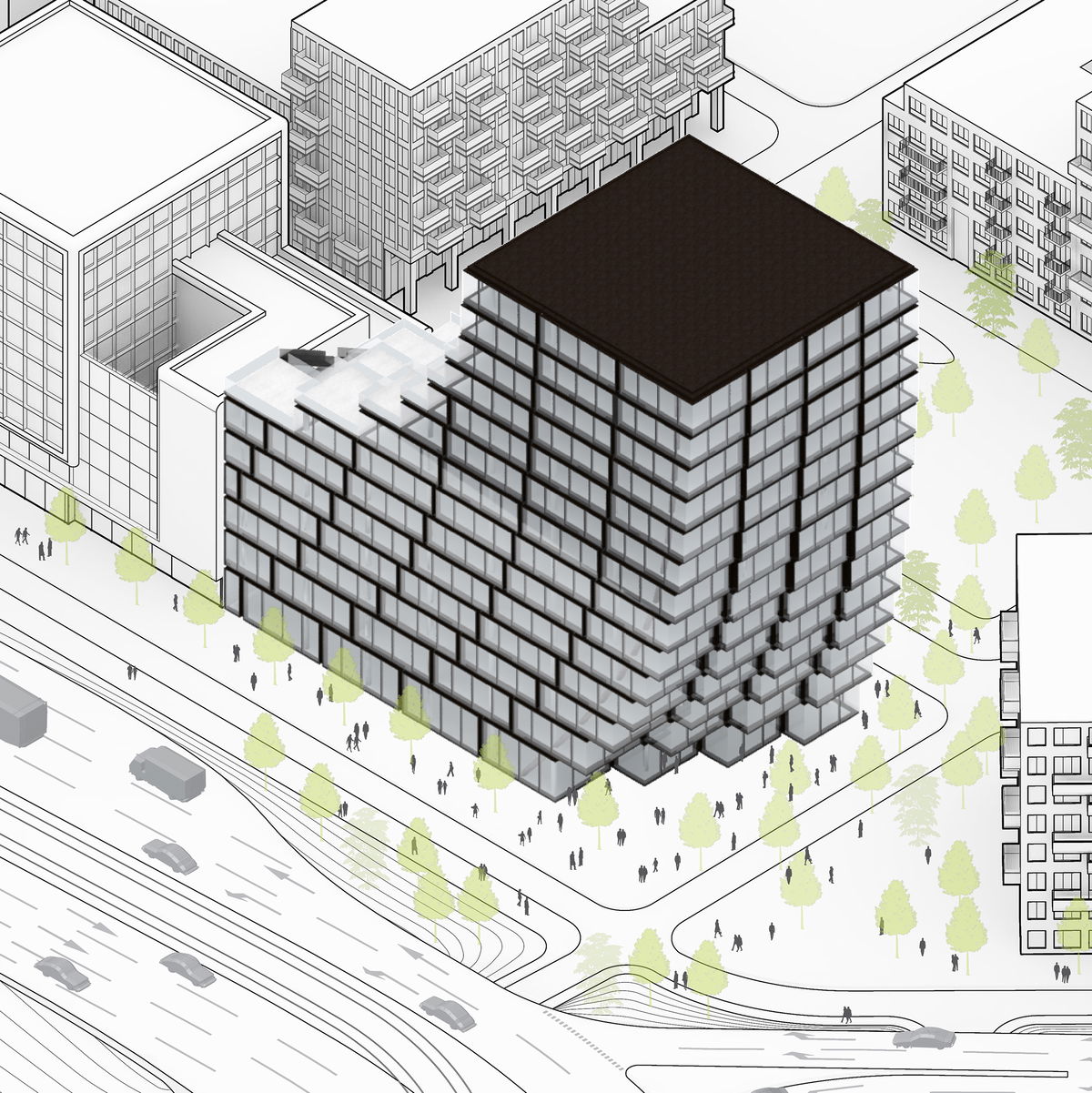 SSHQ — The multifunctional hybrid of a regular office block paired with a tower is leaving space for the public realm, orientated towards the public passing by, while creating a sequence of green terraces for employees.