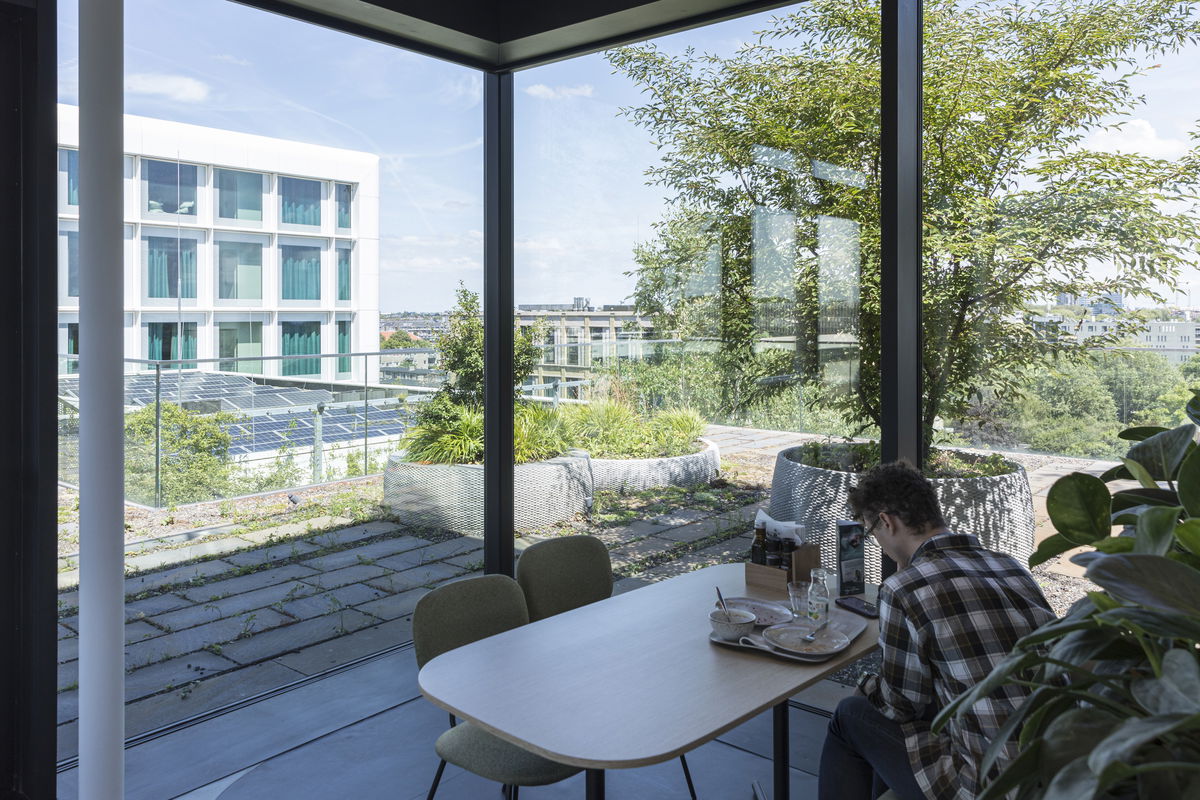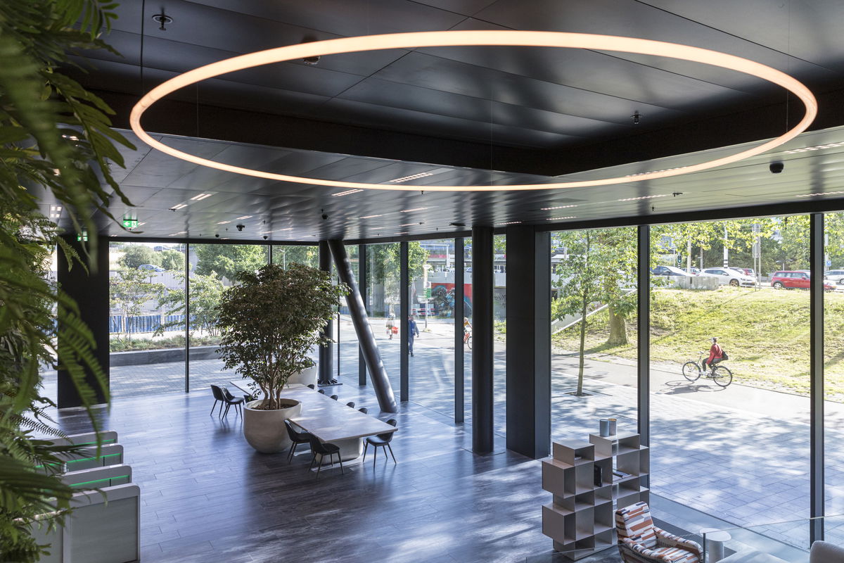 Store Location — The store is located above the entrance level facing Europaboulevard for visibility, while hovering above the green urban pocket below the south facing cantilever, creating a gentle entrance zone to the building.