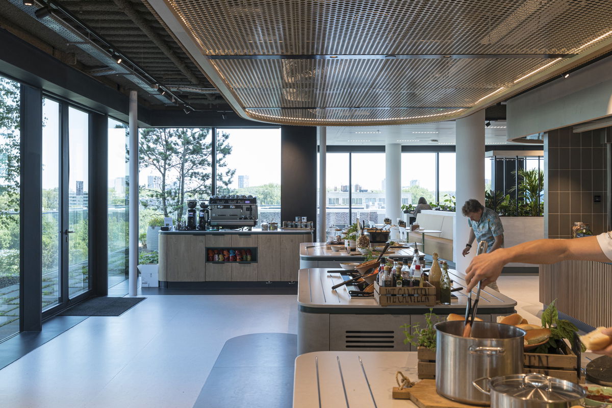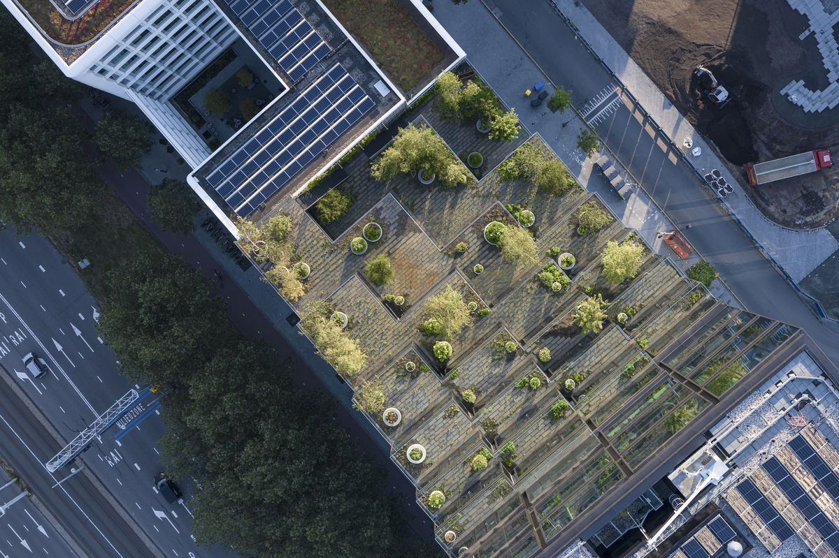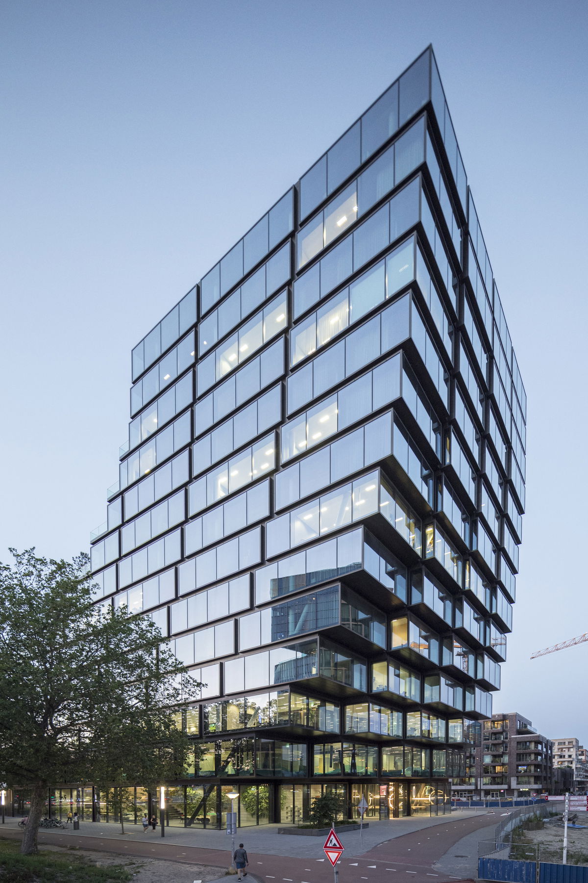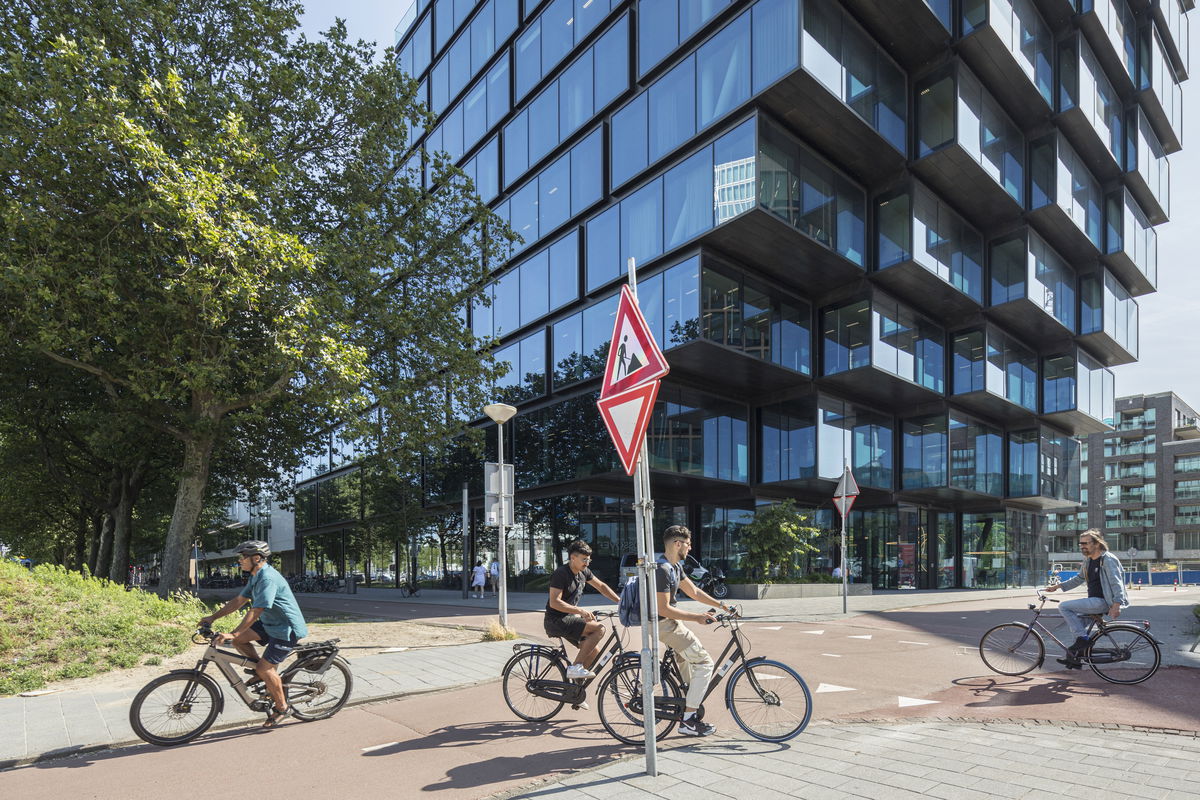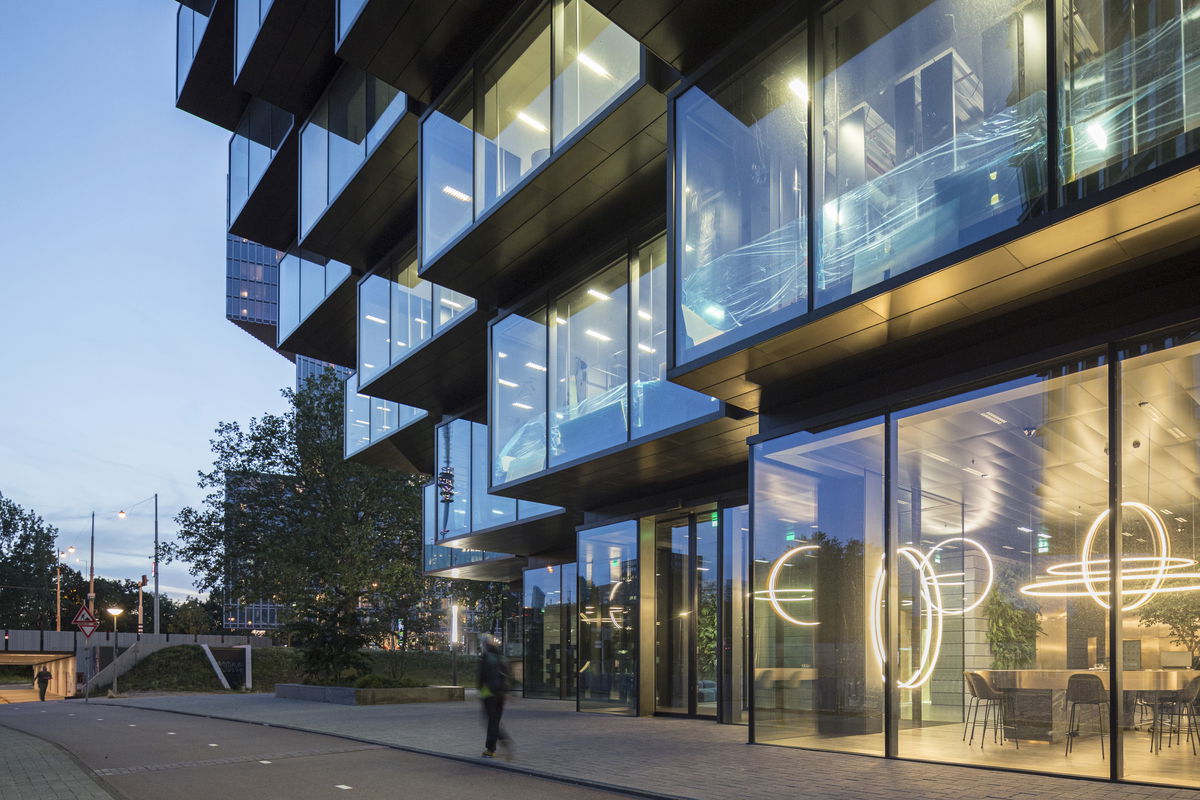 Two Typologies — The much looser height restriction of 58 m in the south allows to add an office tower on top of the office block, creating a distinct building shape and making the building a key part of the Kop Zuidas skyline.