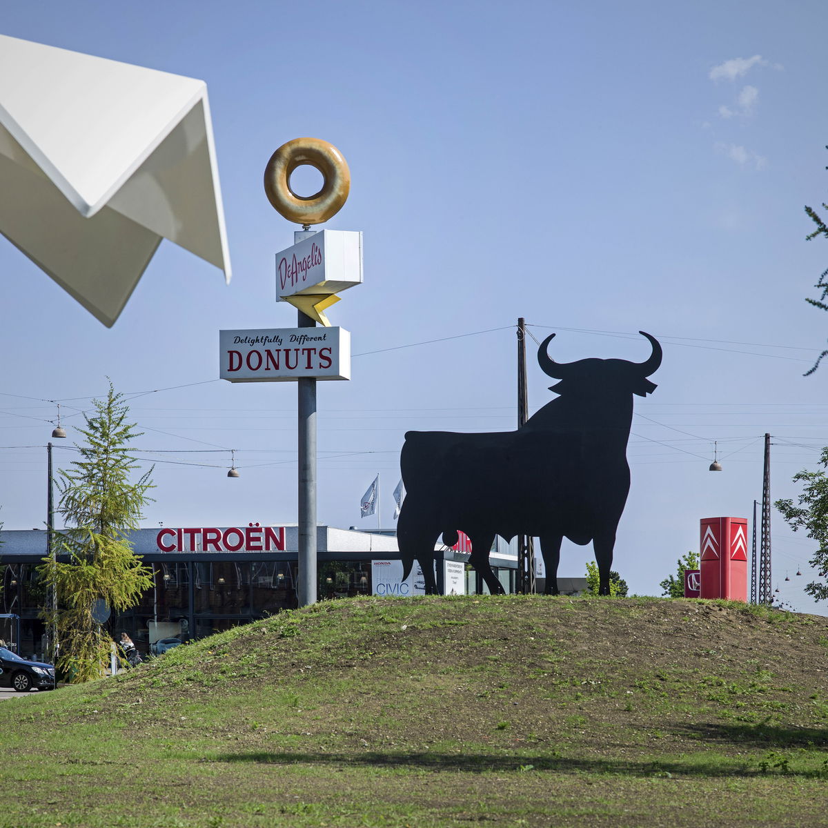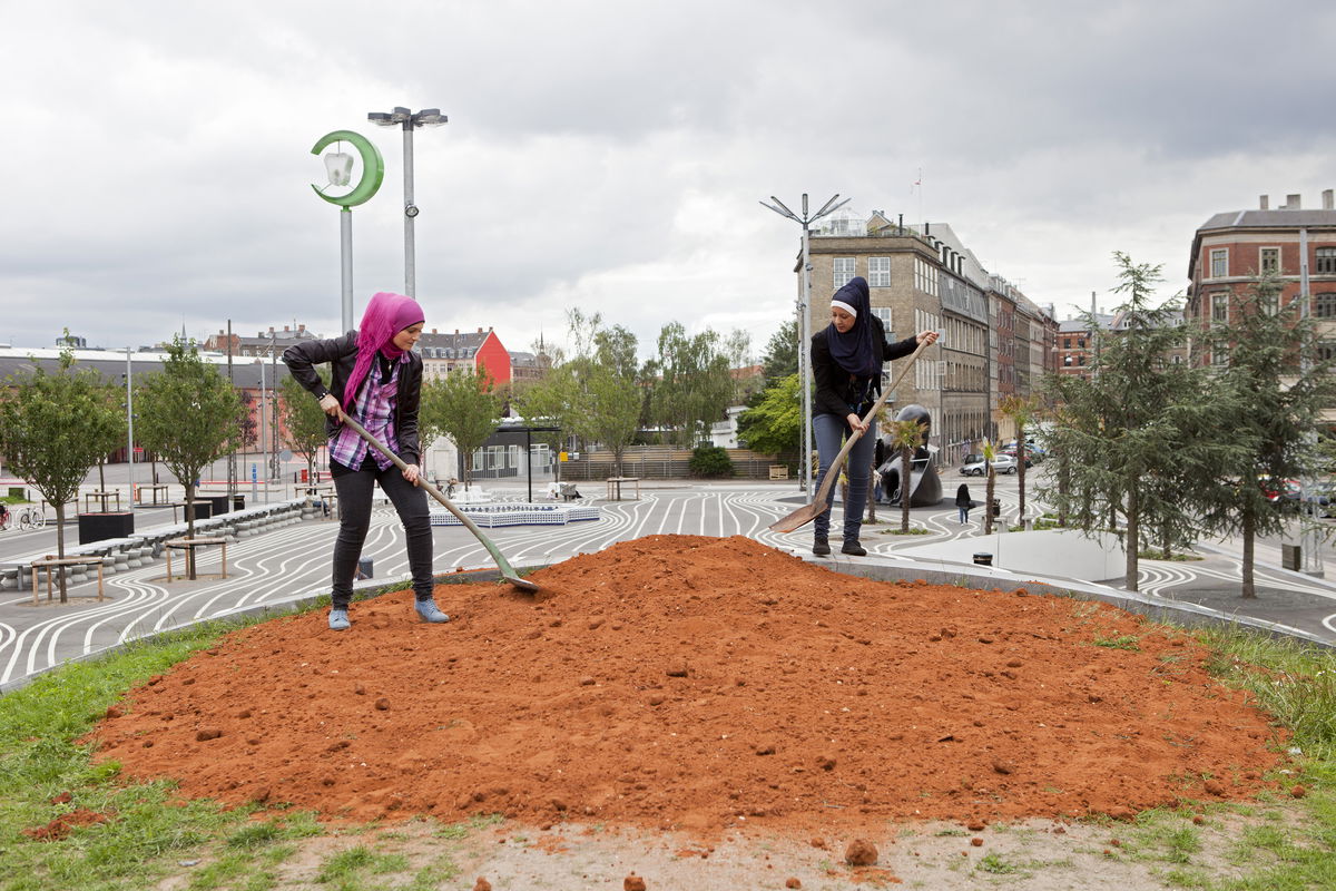 "Our mission was to find the big picture in the extreme detail of a personal memory or story, which on the surface might appear insignificant, but once hunted down and enlarged became super big. A glass of Palestinian soil in a living room in Nørrebro serving as a memory of a lost land, enlarged to a small mountain of Palestinian soil in the park. A distant Mediterranean flirt in the seventies symbolized by a great iron bull, hunted down and raised on a hill in the park."SUPERFLEX - Artist Group