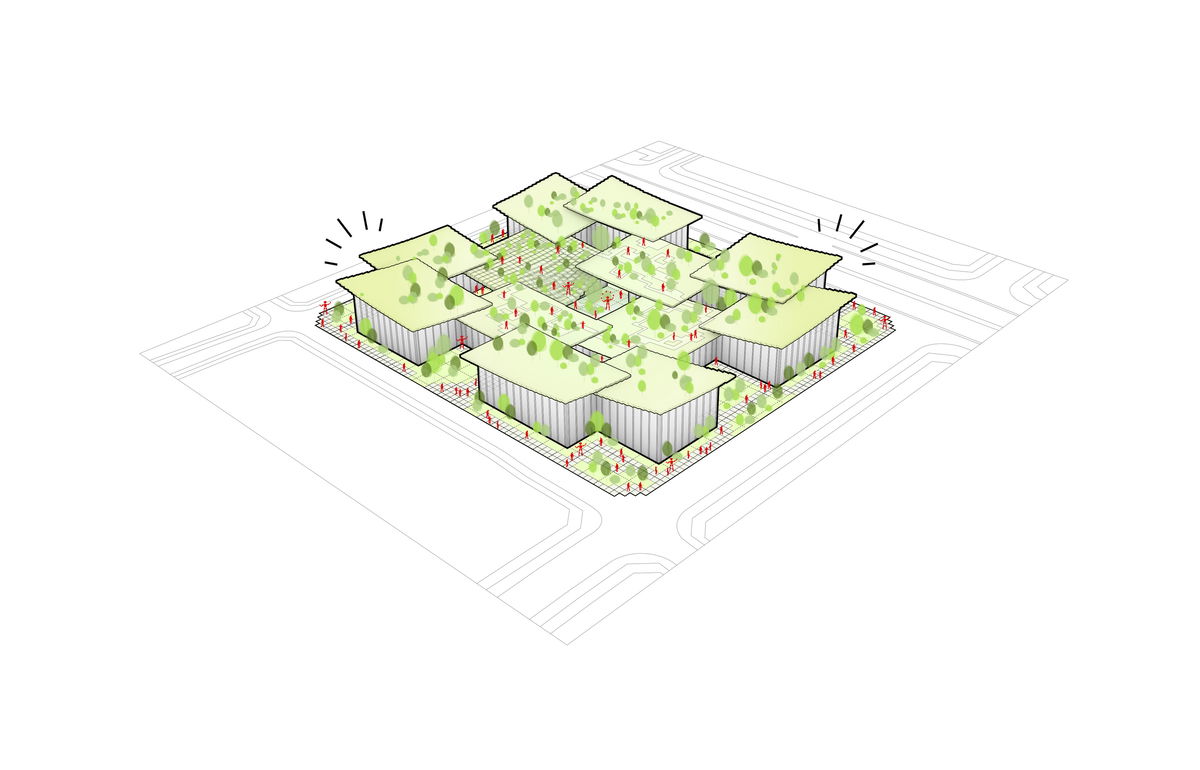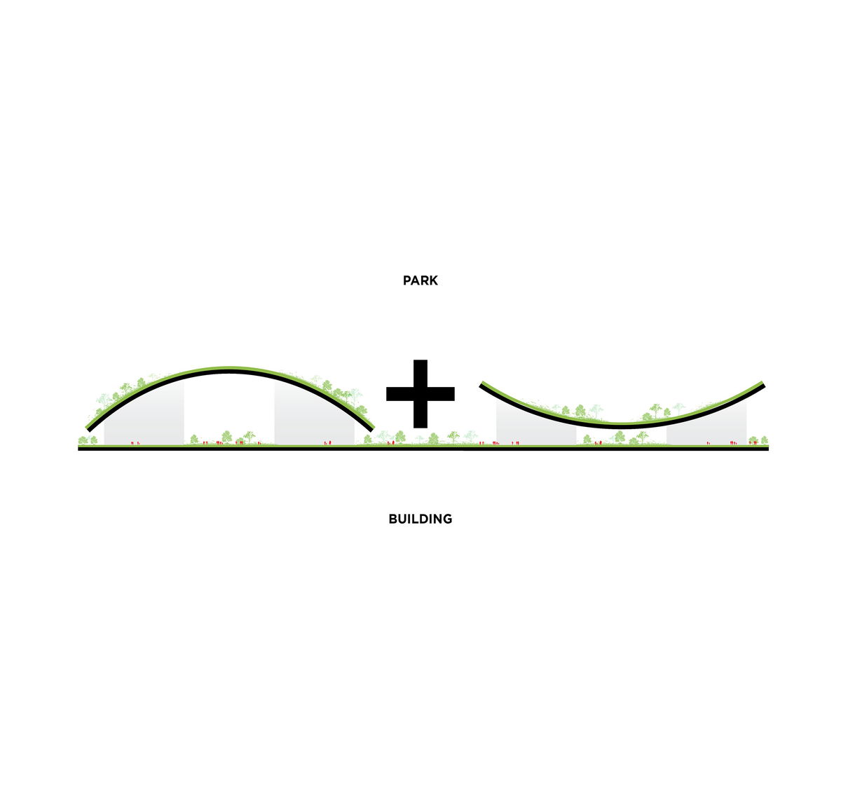 CLOUD VALLEY AND THE GREEN ROOFSCAPE — The roofscape is one of the most important components that shapes the spirit of the Cloud Valley. It allows for an abundance of nature to co-exist with the office programs, thus preserving the wild landscape experience that's traditionally difficult to access within the city limits. The green roof also embodies an ecological cohesive coexistence between human, nature, climate, and technology.