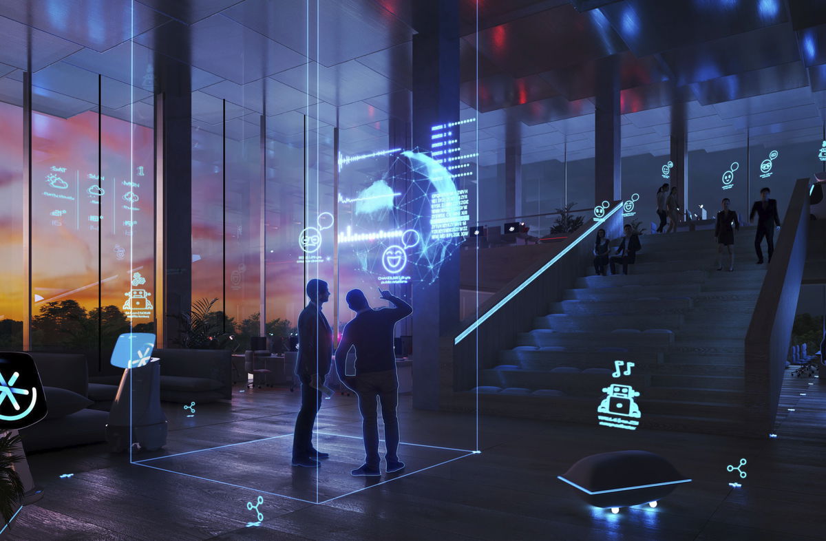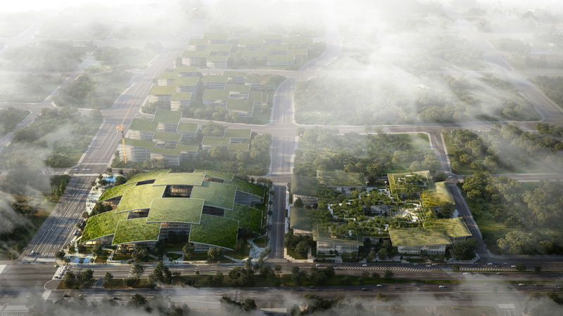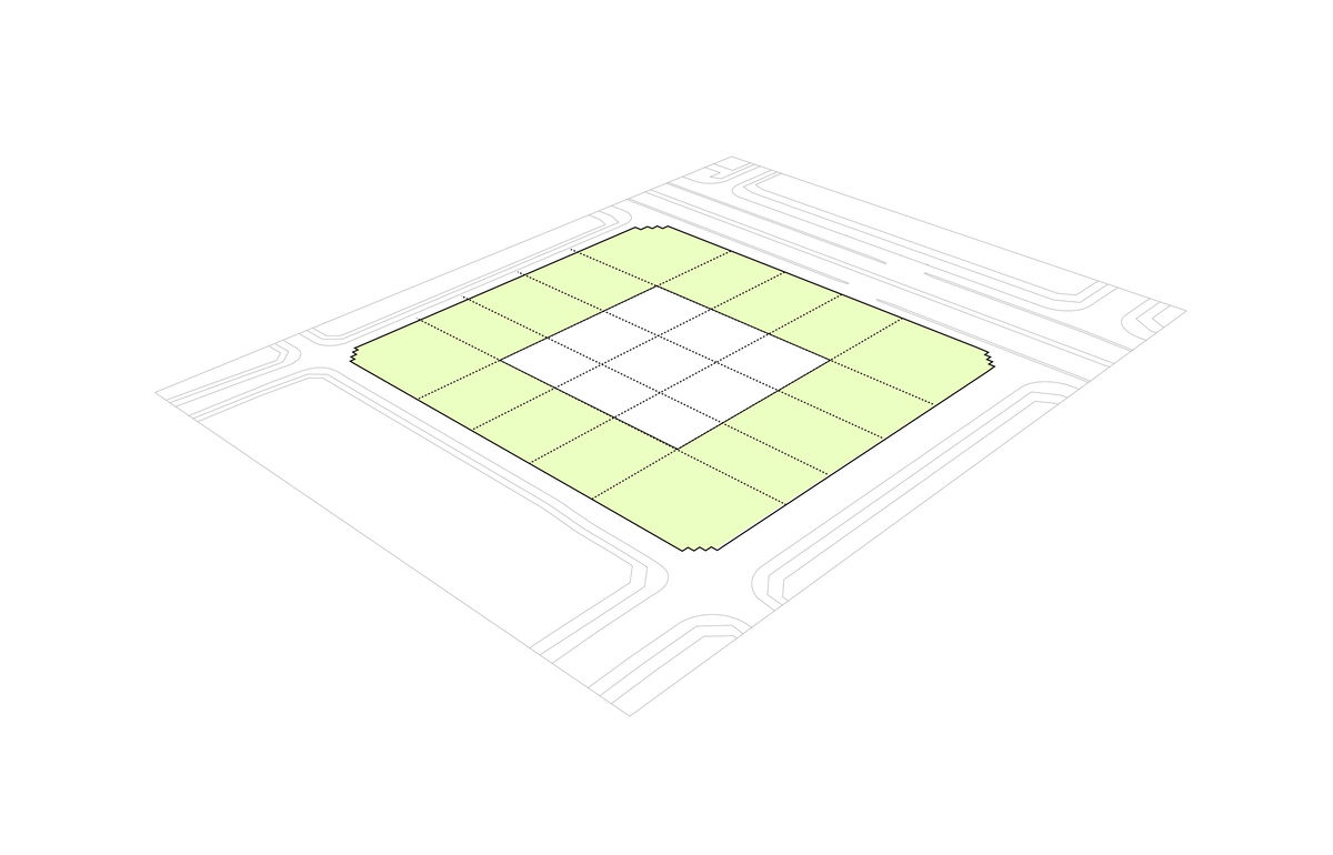 GRID & AI — BIG proposes a grid layout on the entire site. This will be the keystone identity for the campus, knitting together the parking basement, landscape, building and green roofscape, as well as adding a new, visible layer of AI-linking landscape, building, and future technology.