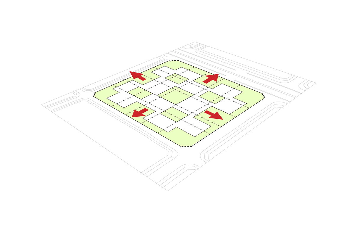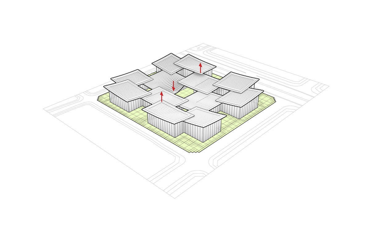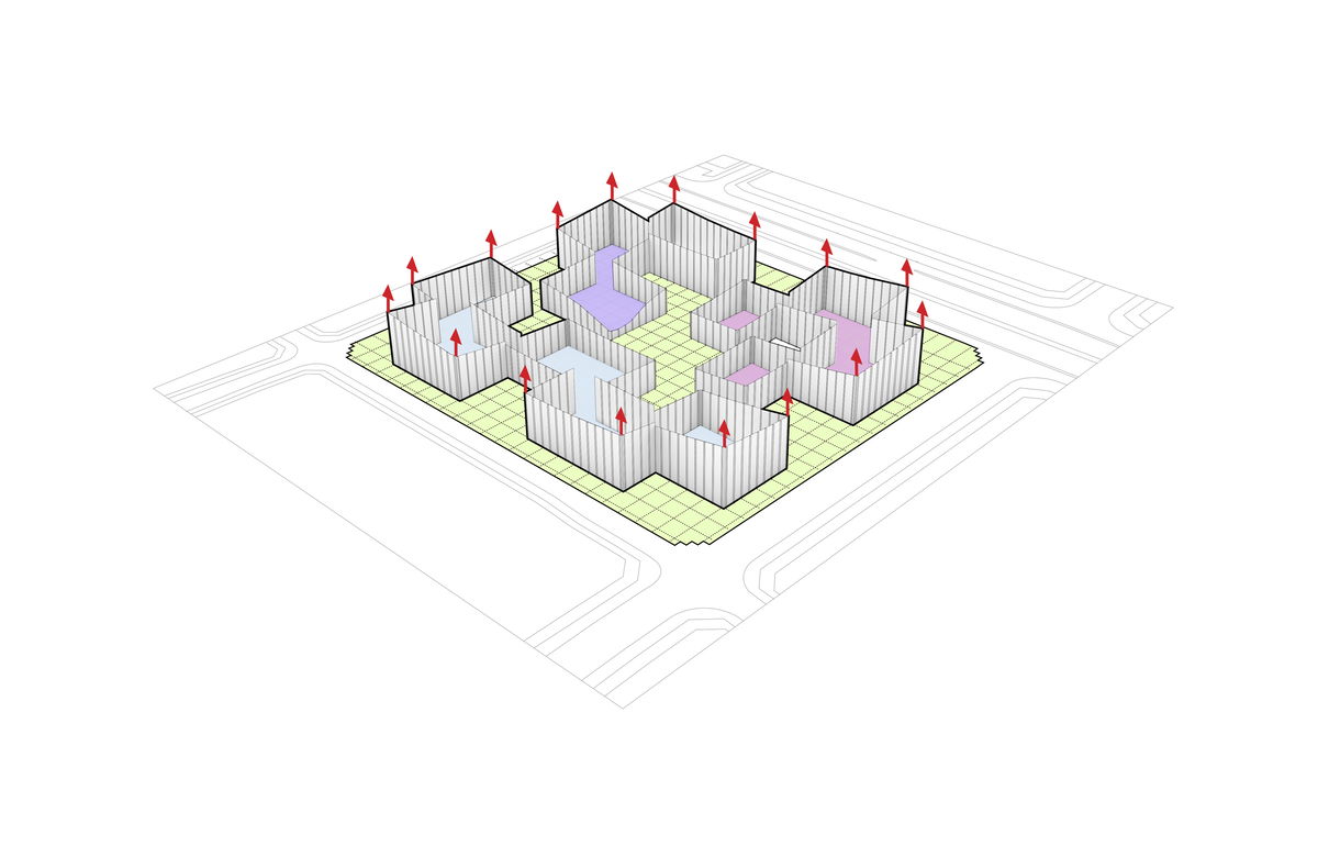 SITE EXTRUSION — The two plots are bounded by a maximum height limit, determined by flight restrictions from a nearby military airport. By only raising the outer façade line to its maximum height and keeping the central space closer to the eye-level, the buildings are adapted to the human-scale in the shape of a valley.