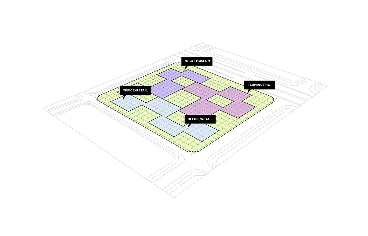 PROGRAM — Terminus HQ is located in the southwest corner of the site, while the Robot Museum sits on the opposite end in the southeast corner. The buildings to the north are office spaces with retail in the two lower floors.