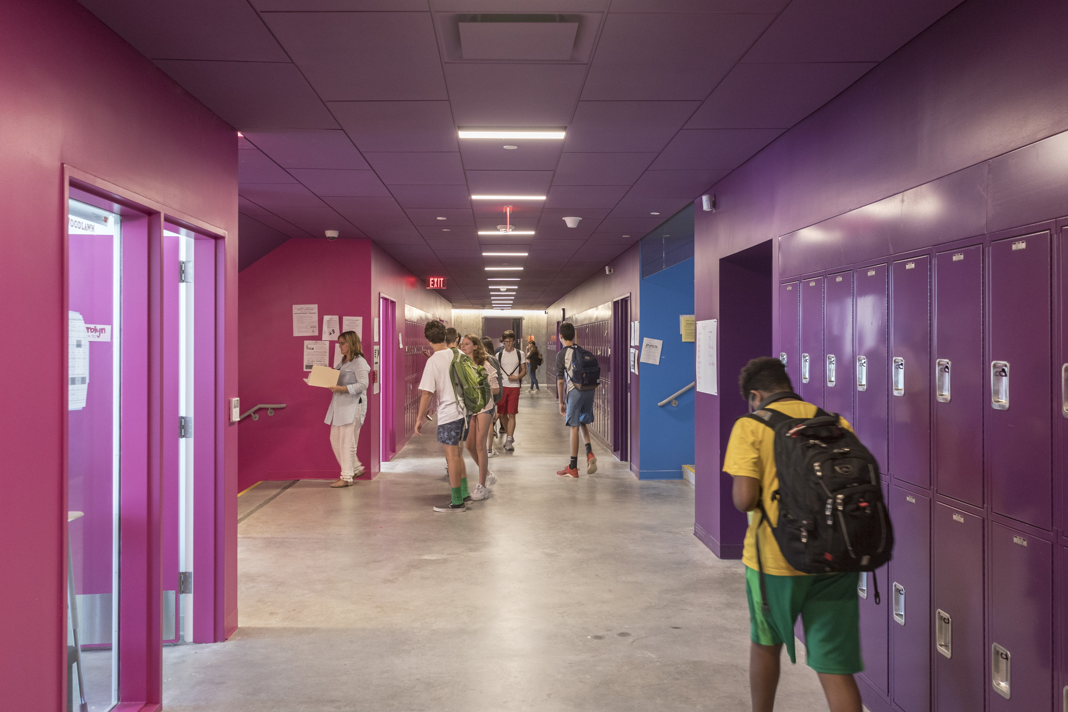 Easy accessibility to the community-oriented programs hosted in the school encourages public interaction throughout the building, creating a welcoming environment while heightening the visual connectivity between the shared spaces. Other specialized student spaces include an art studio, science and robotic labs, music rehearsal rooms, and two performing arts theaters.