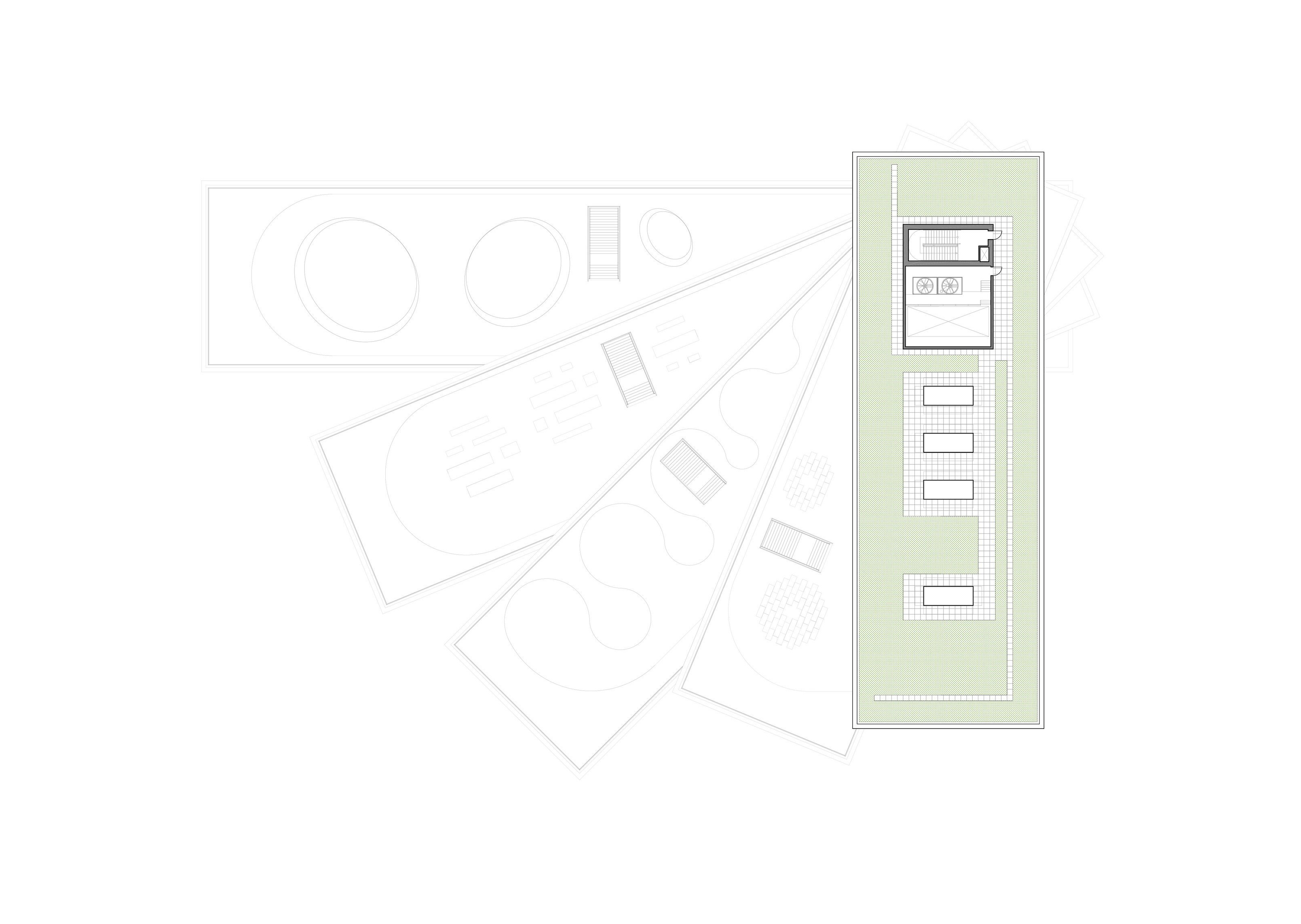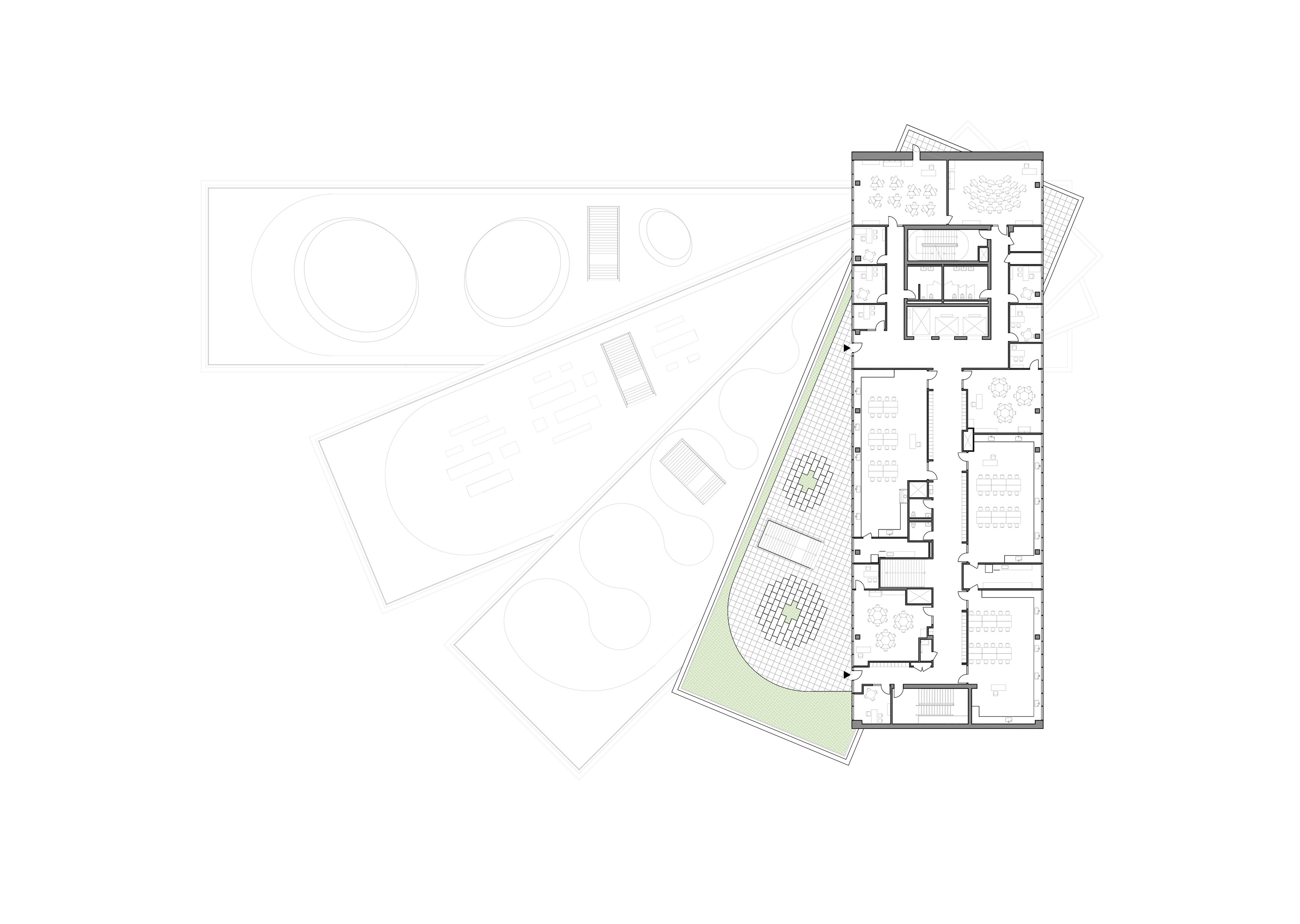 Green terraces above each floor become an extension of the classroom, creating an indoor-outdoor learning landscape for both students and teachers – an educational oasis rather than a traditional school setting. A rotating central staircase cuts through the interior of the building to connect the four-tiered terraces, allowing students to circulate outside and forge a stronger bond between the neighborhood and the school. While the upper terraces are more suitable for intimate classes and quiet study areas, the spacious first terrace and 18,700 sq ft recreation field also serve as public event venues for school-wide and neighborhood activities.