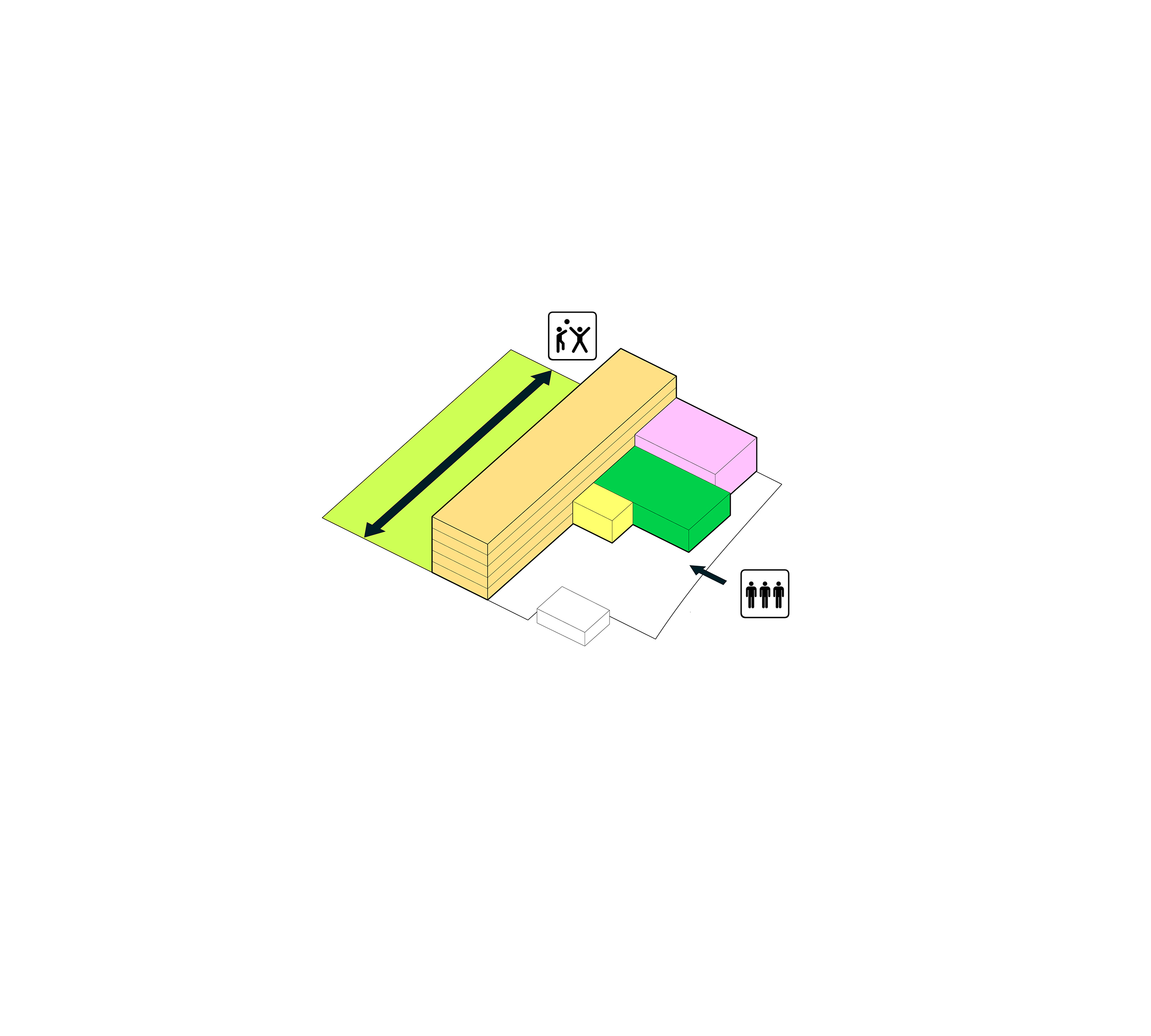 The classroom bars serve as the primary organizing elements, surrounding a central vertical core that contains the elevators, stairs and bathrooms. As students enter from the central staircase, they are greeted by an expanded gradient of the color spectrum: each classroom bar is defined by its own color, combining intuitive wayfinding with a vibrant social atmosphere from the ground to the sky.