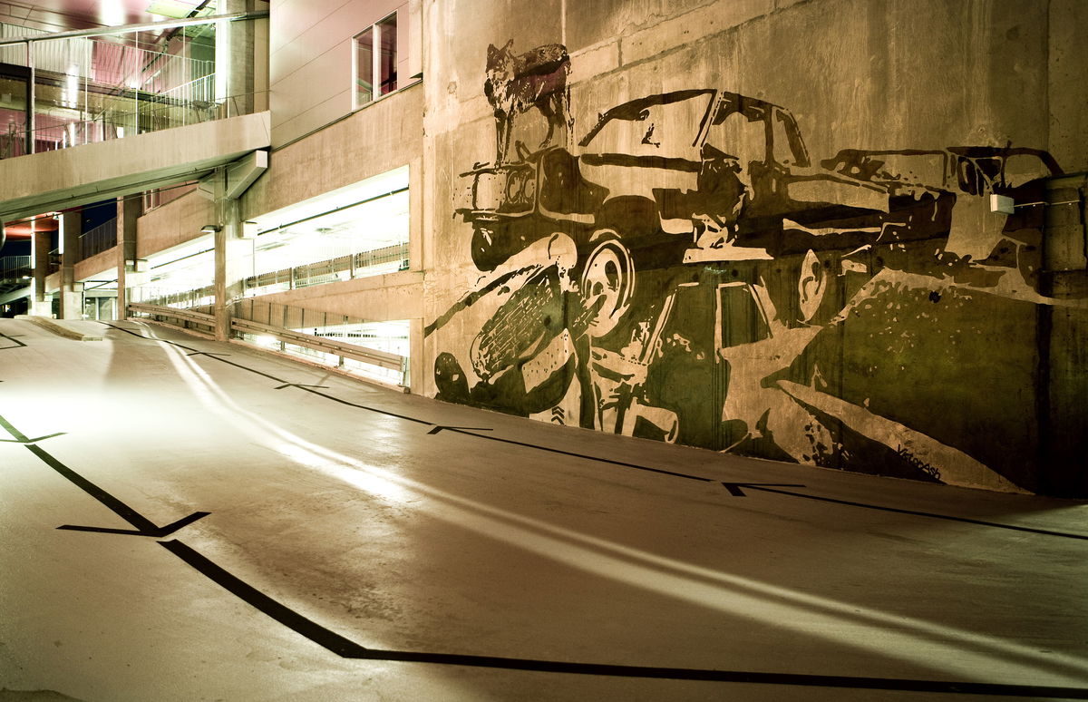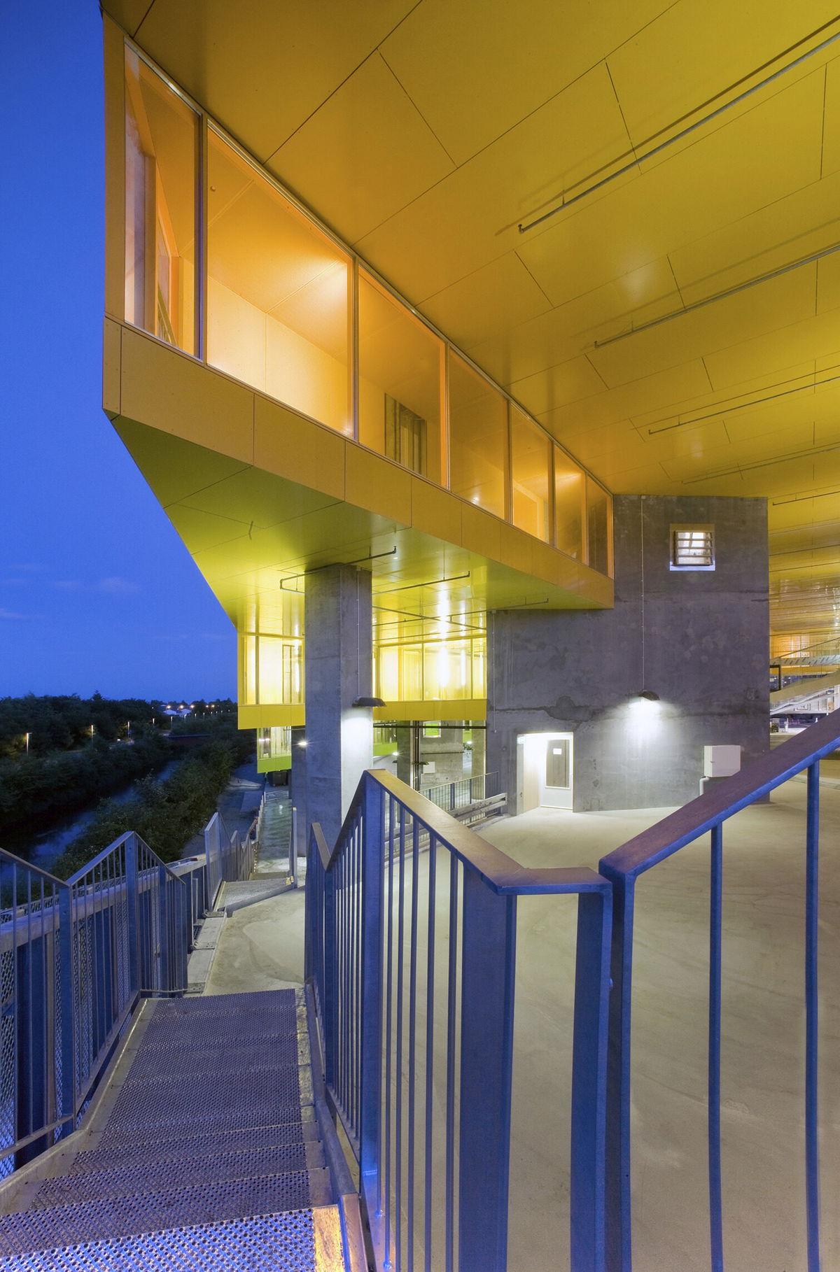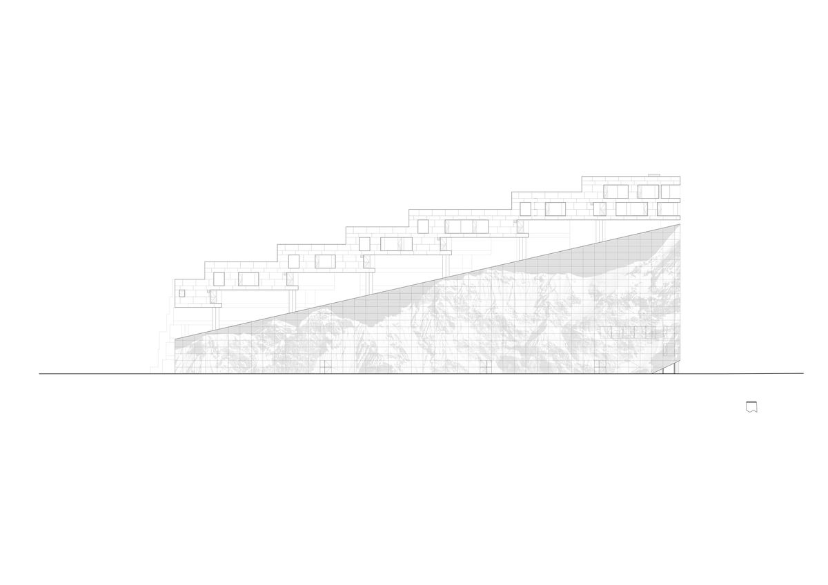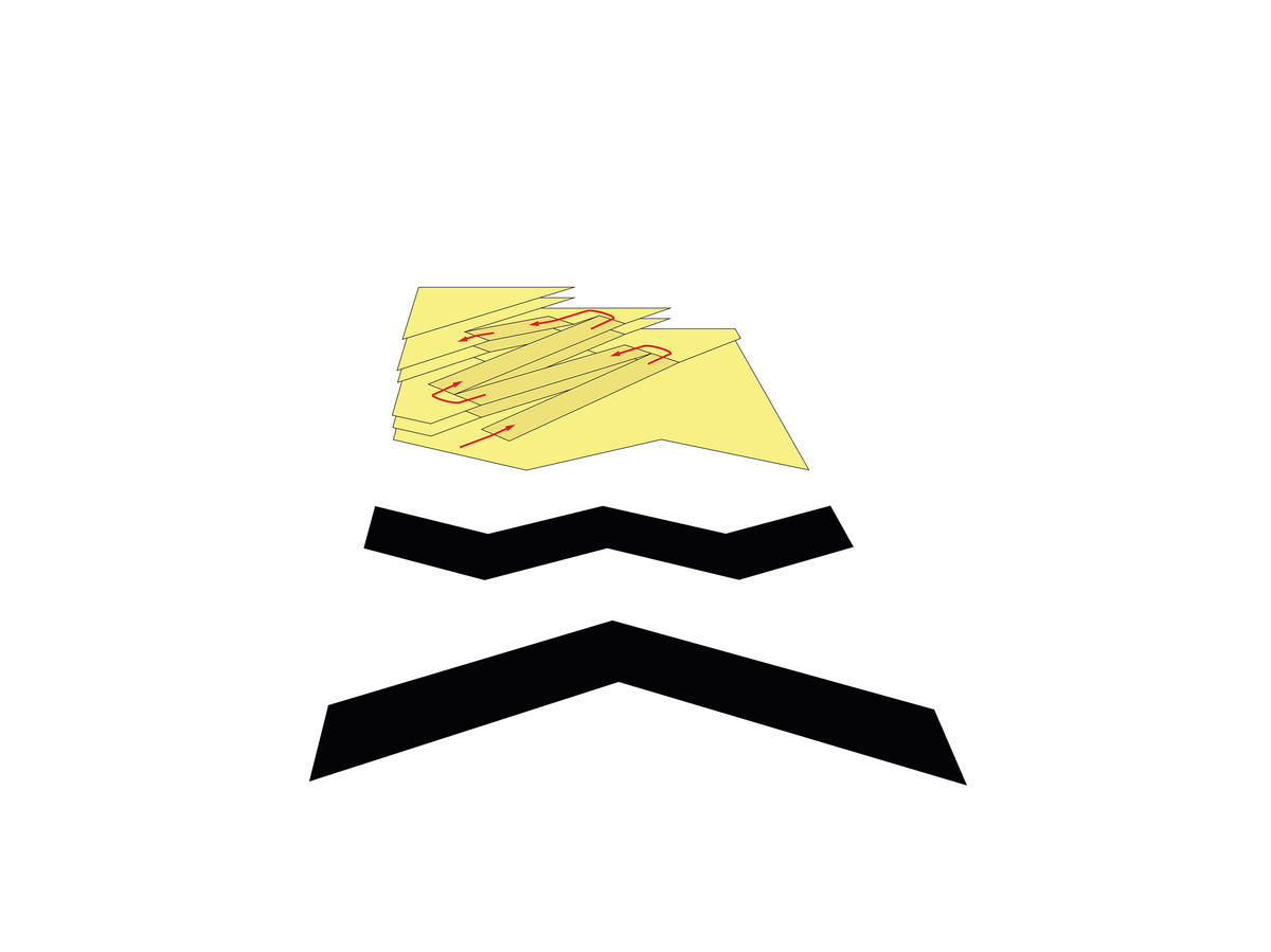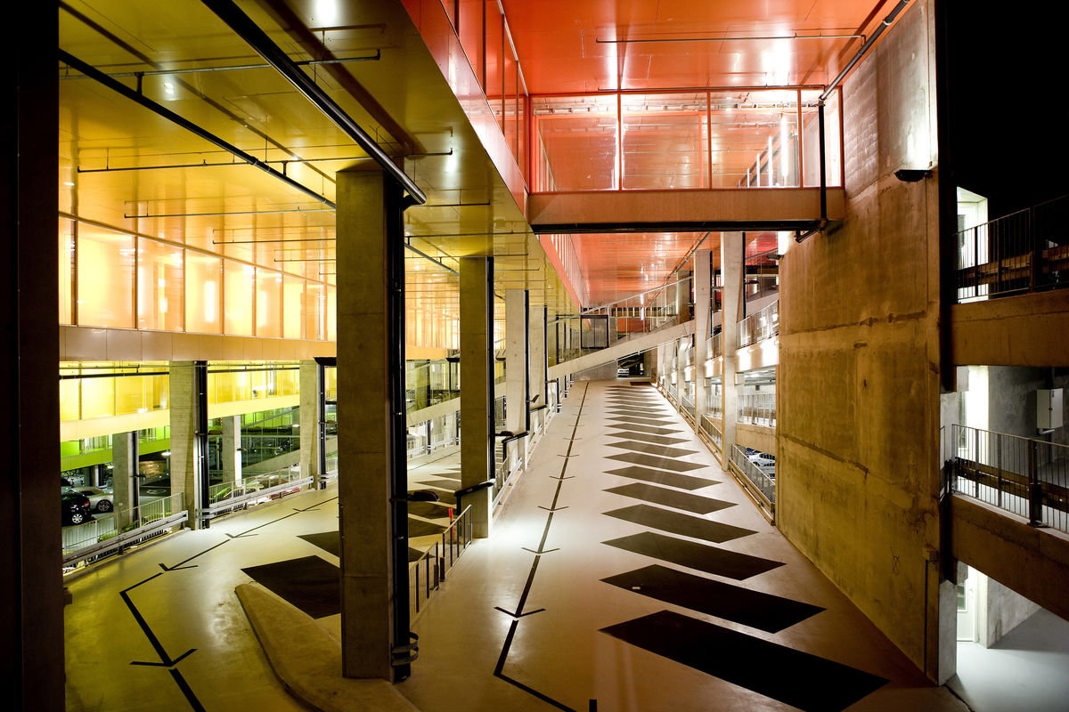 — The parking structure is sloping upwards in a serpentine zigzag from south to north.
