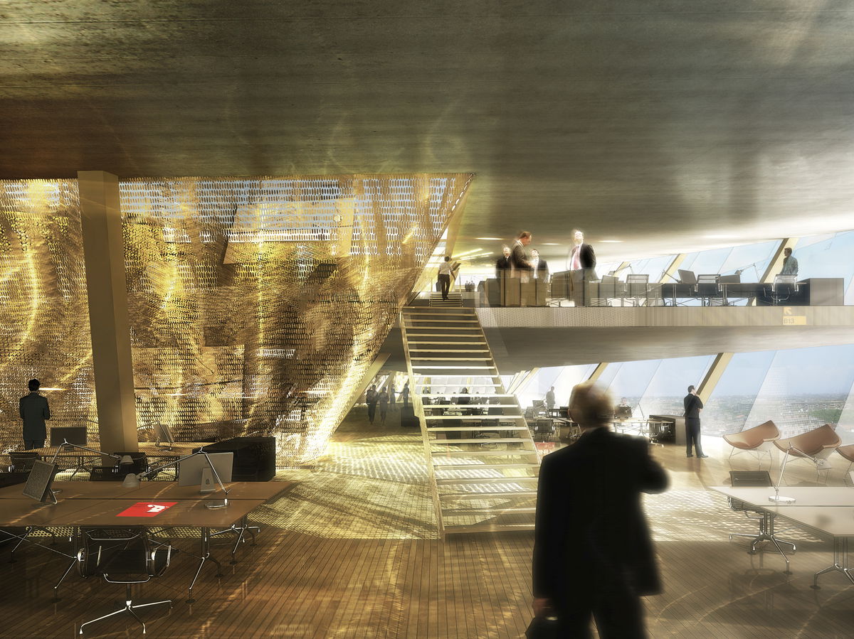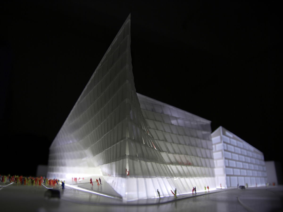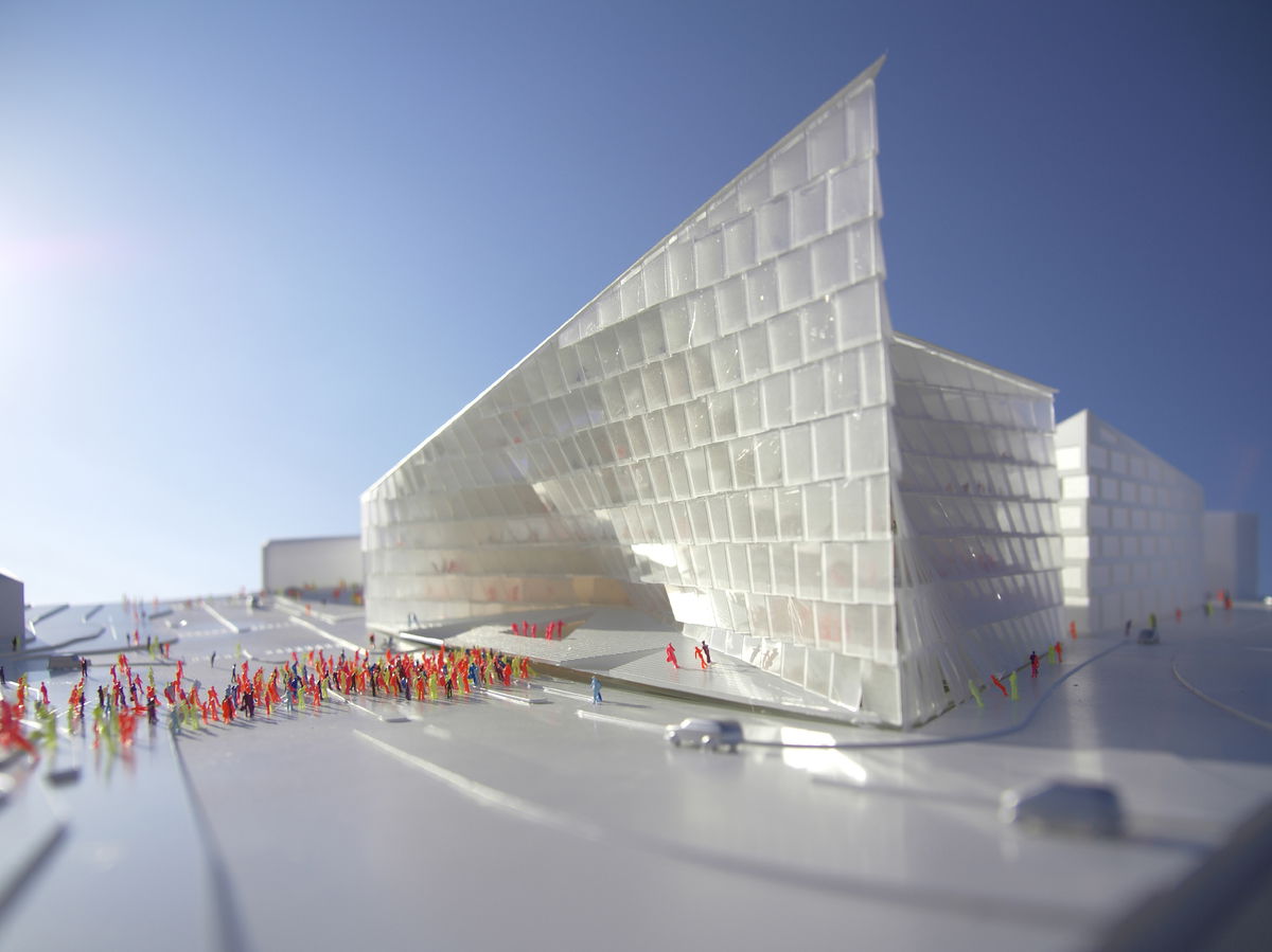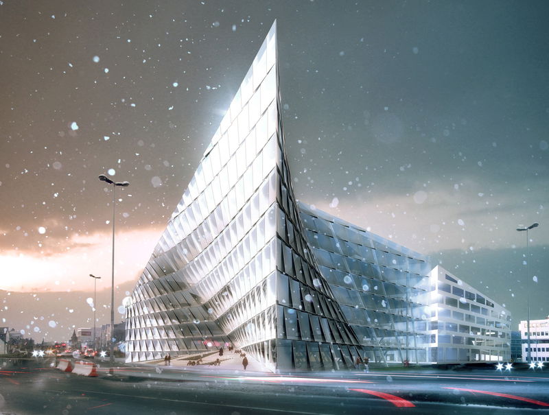 — Finally the two receding facades form an urban archway over the central courtyard, turning it into an urban void illuminated by a zigzag-shaped skylight, like a crack in a glacier.