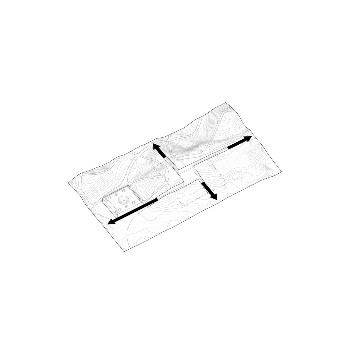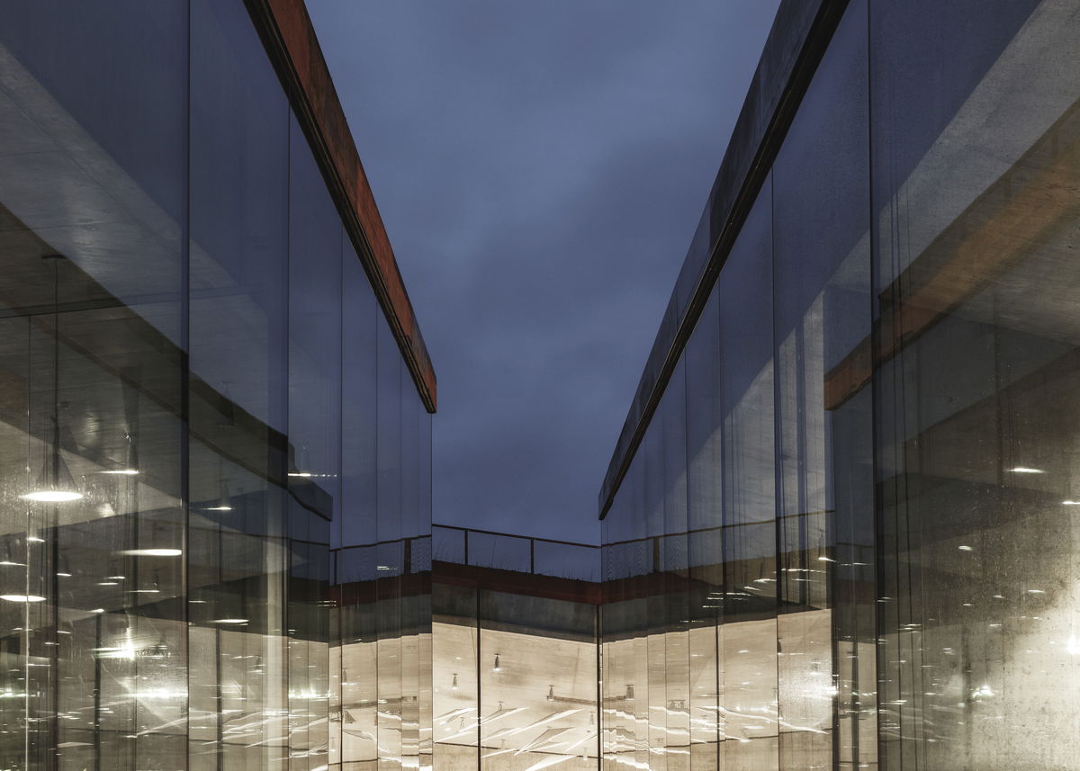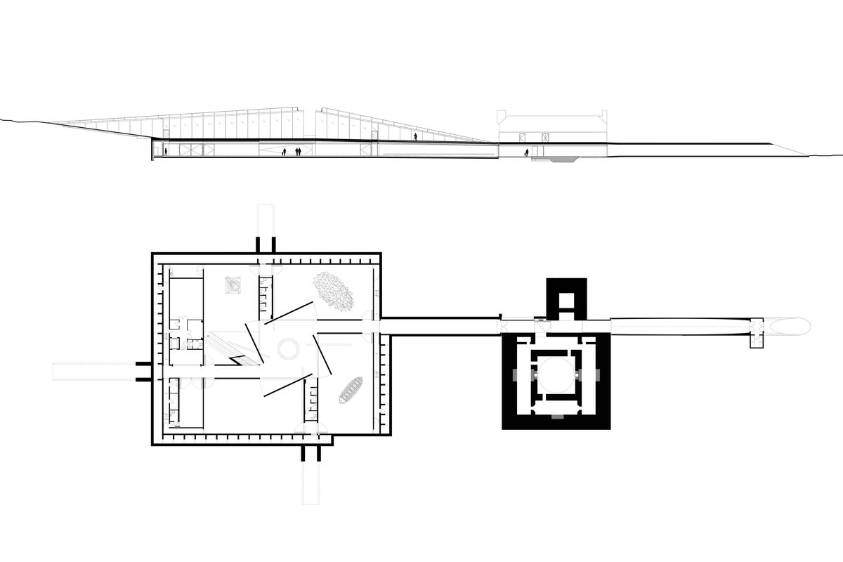 Sunken Void — Two paths intersect at the museum like surgical slices into the dunes. A sunken void is surrounded by the four galleries of the respective museums, bringing daylight and views to the buried spaces.
