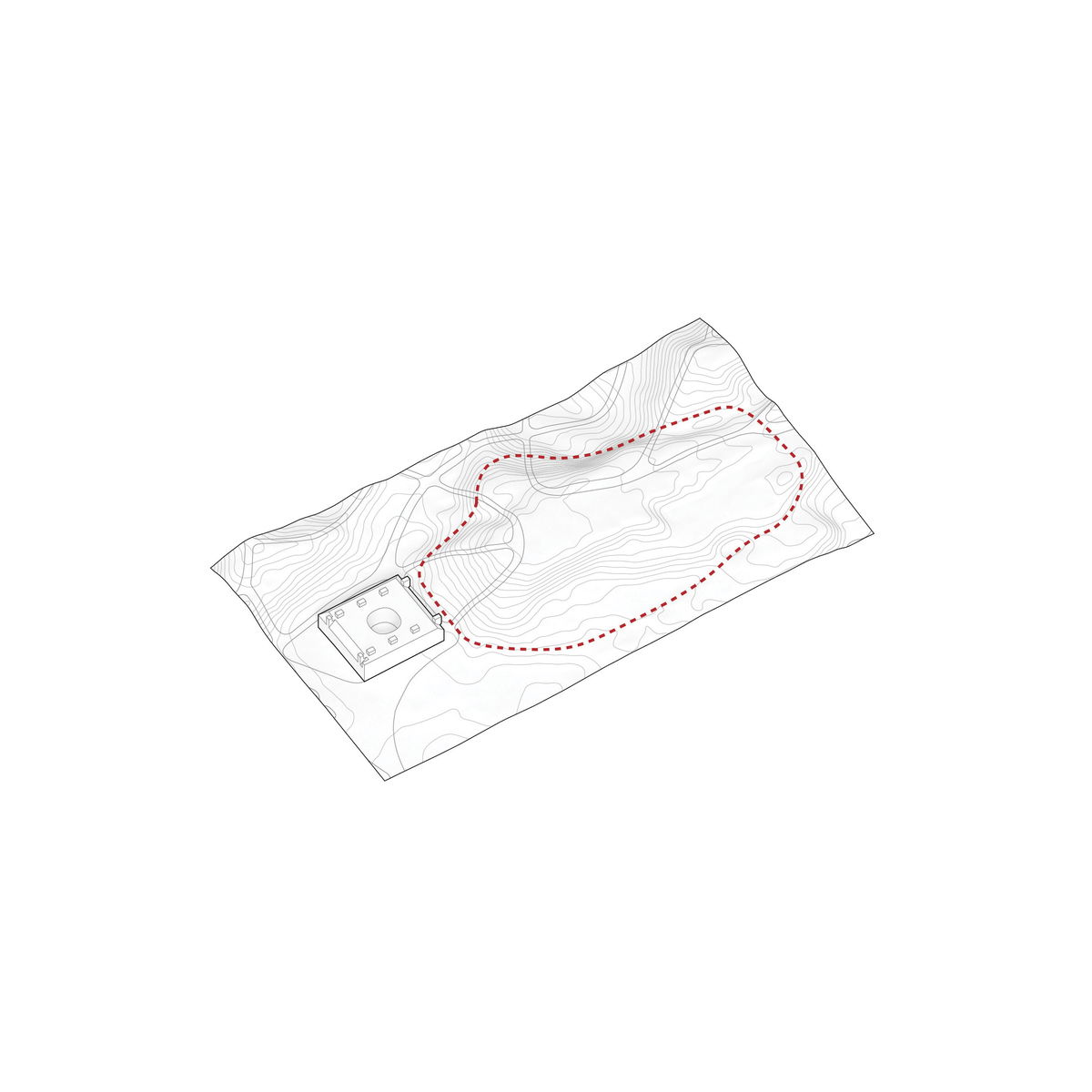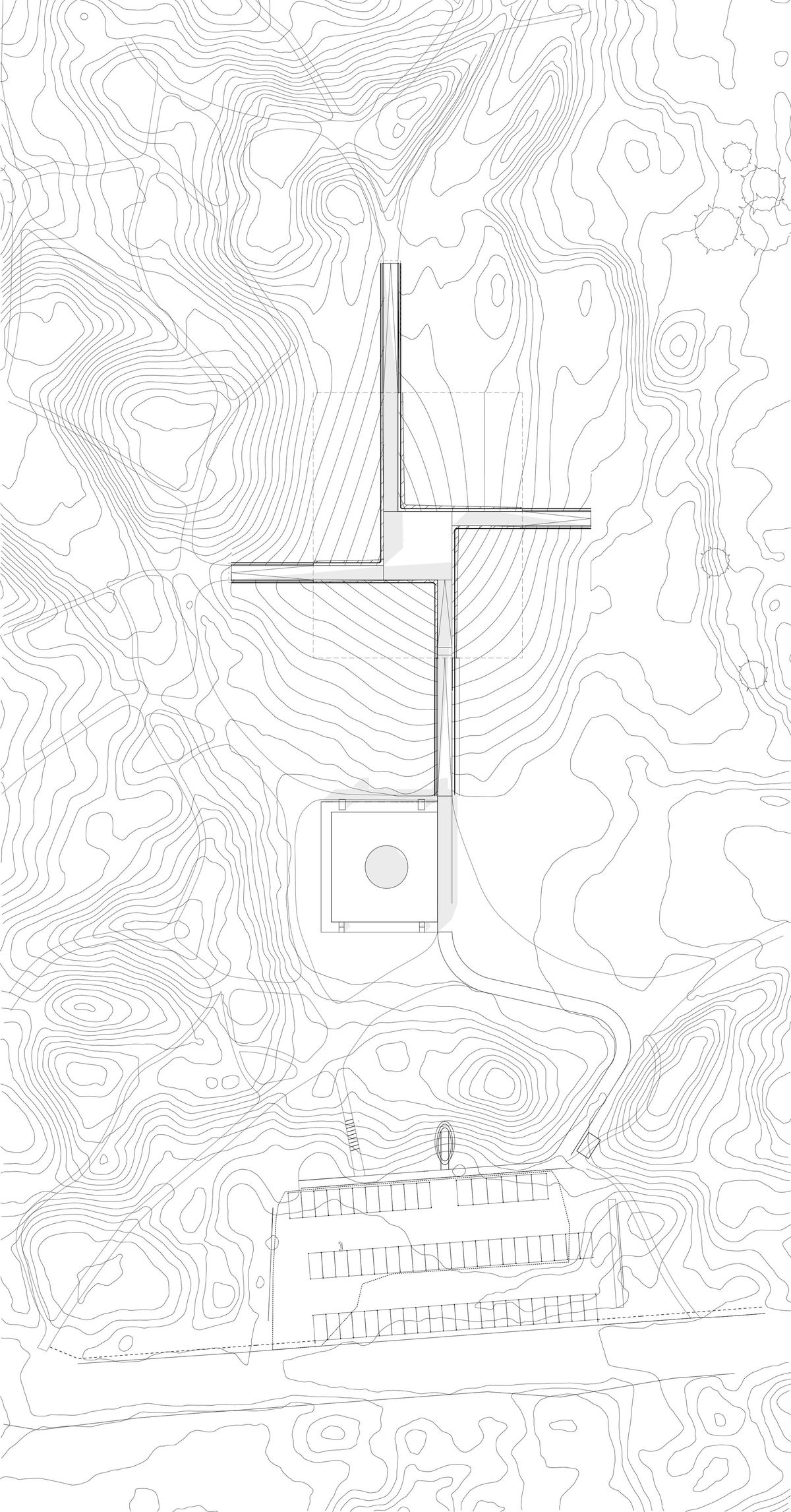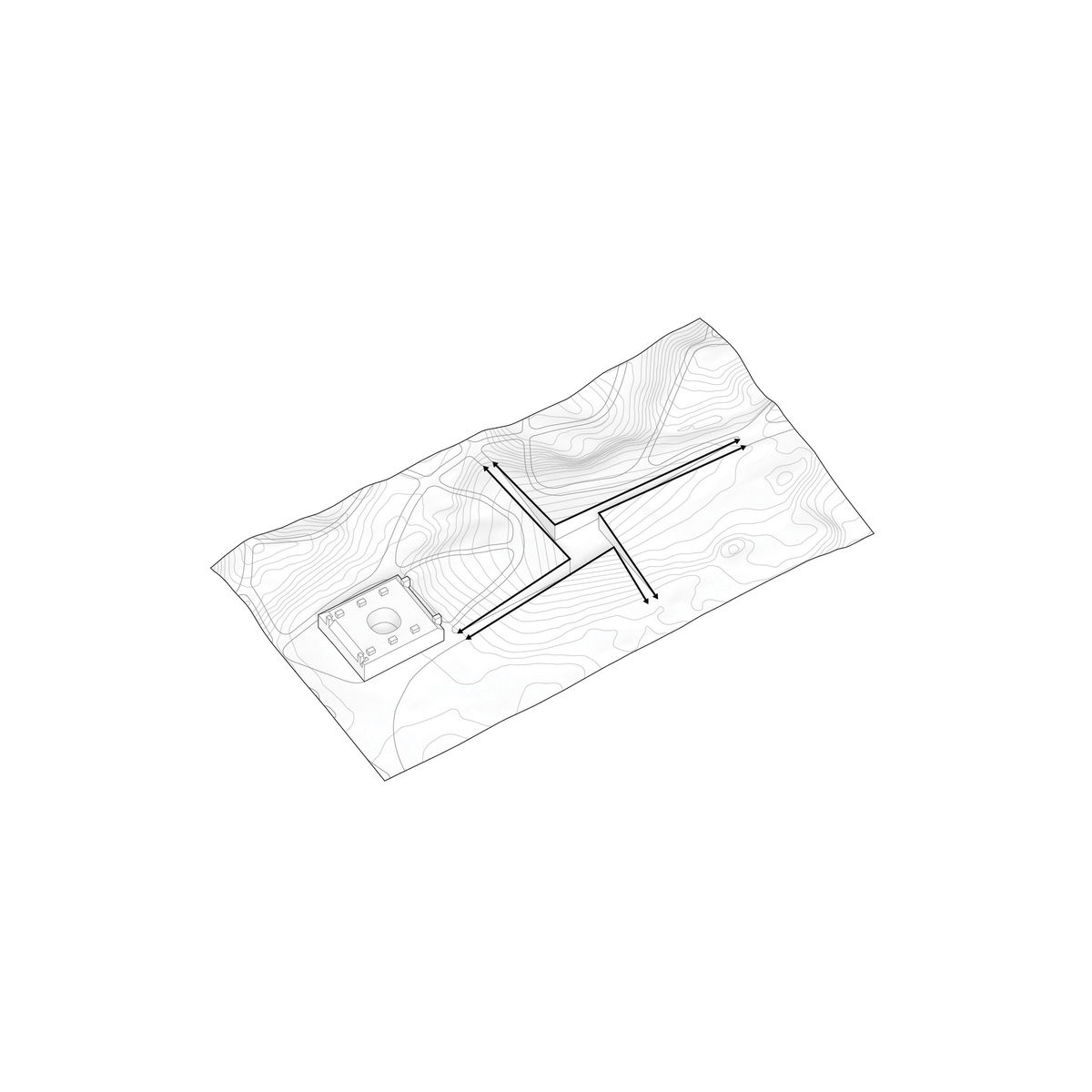 Sunken Void — Two paths intersect at the museum like surgical slices into the dunes. A sunken void is surrounded by the four galleries of the respective museums, bringing daylight and views to the buried spaces.