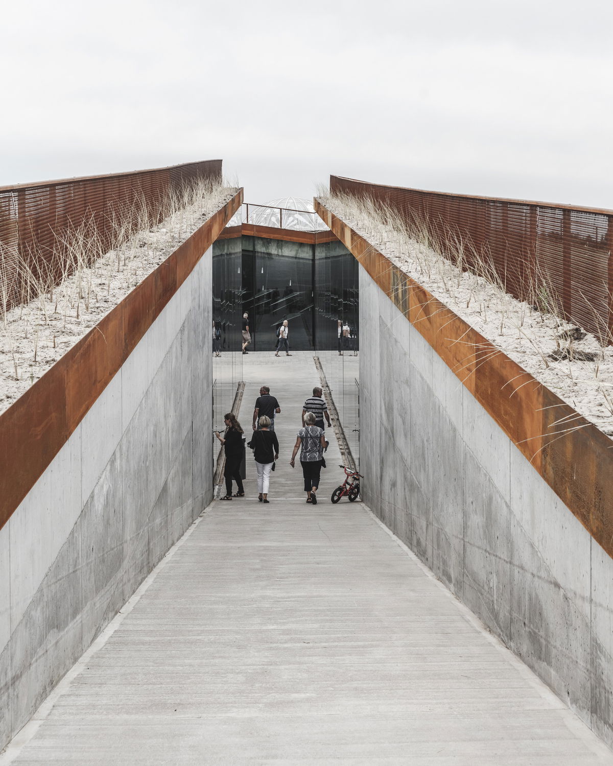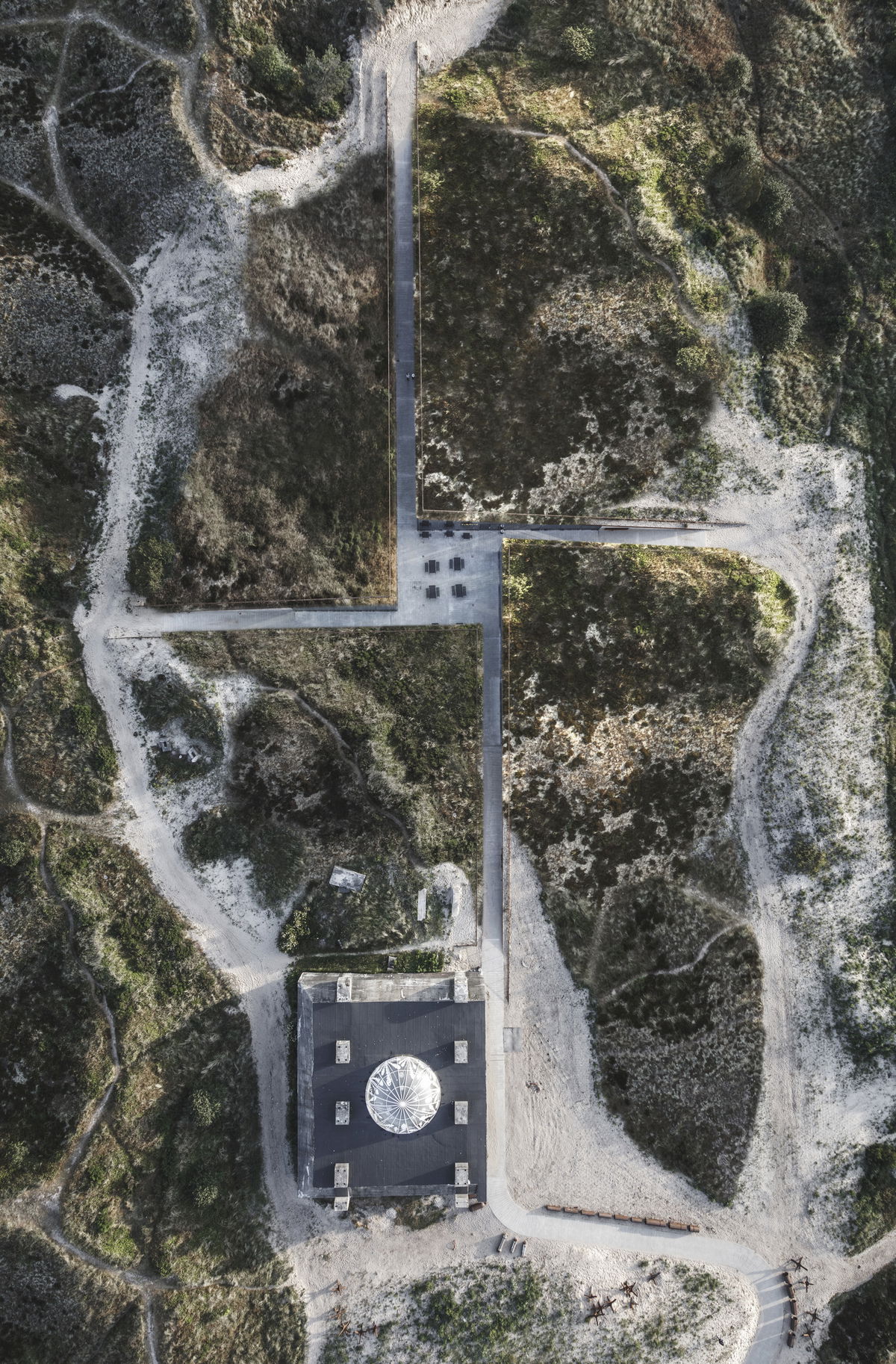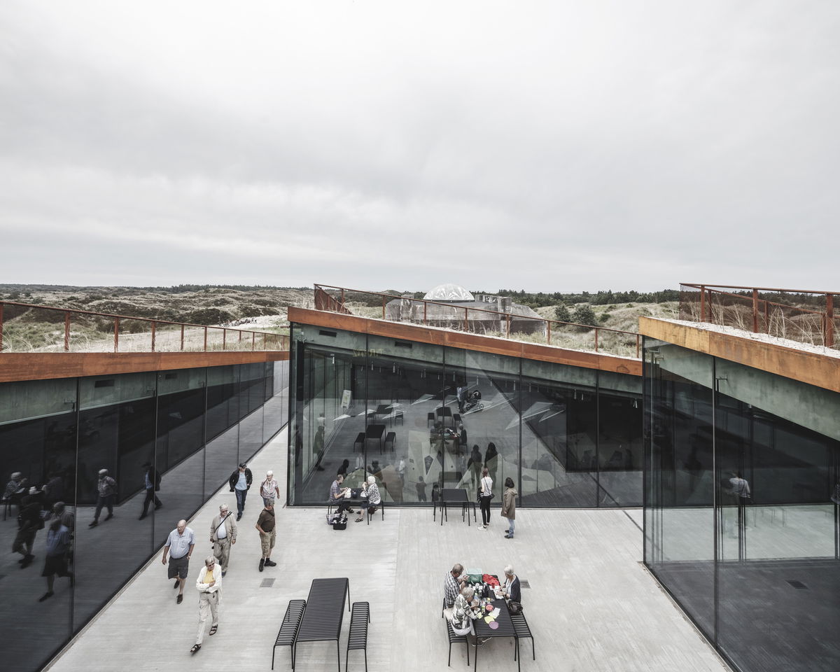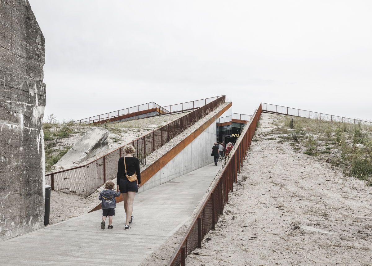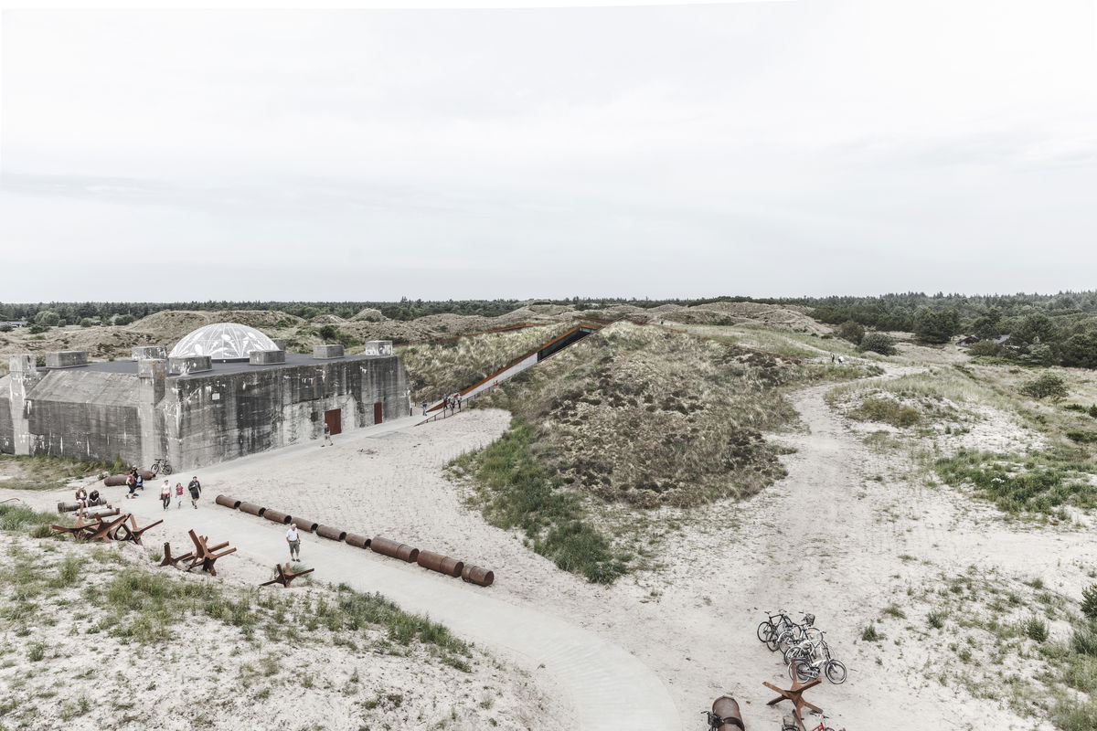 "The architecture of Tirpitz is the antithesis to the WWII bunker. The heavy hermetic object is countered by the inviting lightness and openness of the new museum. The galleries are integrated into the dunes like an open oasis in the sand - a sharp contrast to the Nazi fortress’ concrete monolith. The surrounding heath-lined pathways cut into the dunes from all sides descending to meet in a central clearing, bringing daylight and air into the heart of the complex. The bunker remains the only landmark of a not so distant dark heritage that, upon close inspection, marks the entrance to a new cultural meeting place."Bjarke Ingels - Founder & Creative Director, BIG