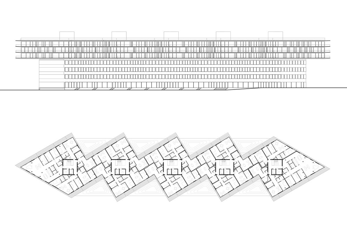 Rotation — Each section is rotated in order to improve facade area, allowing for plenty of daylight into all units, while retaining the efficiency of a point house typology.