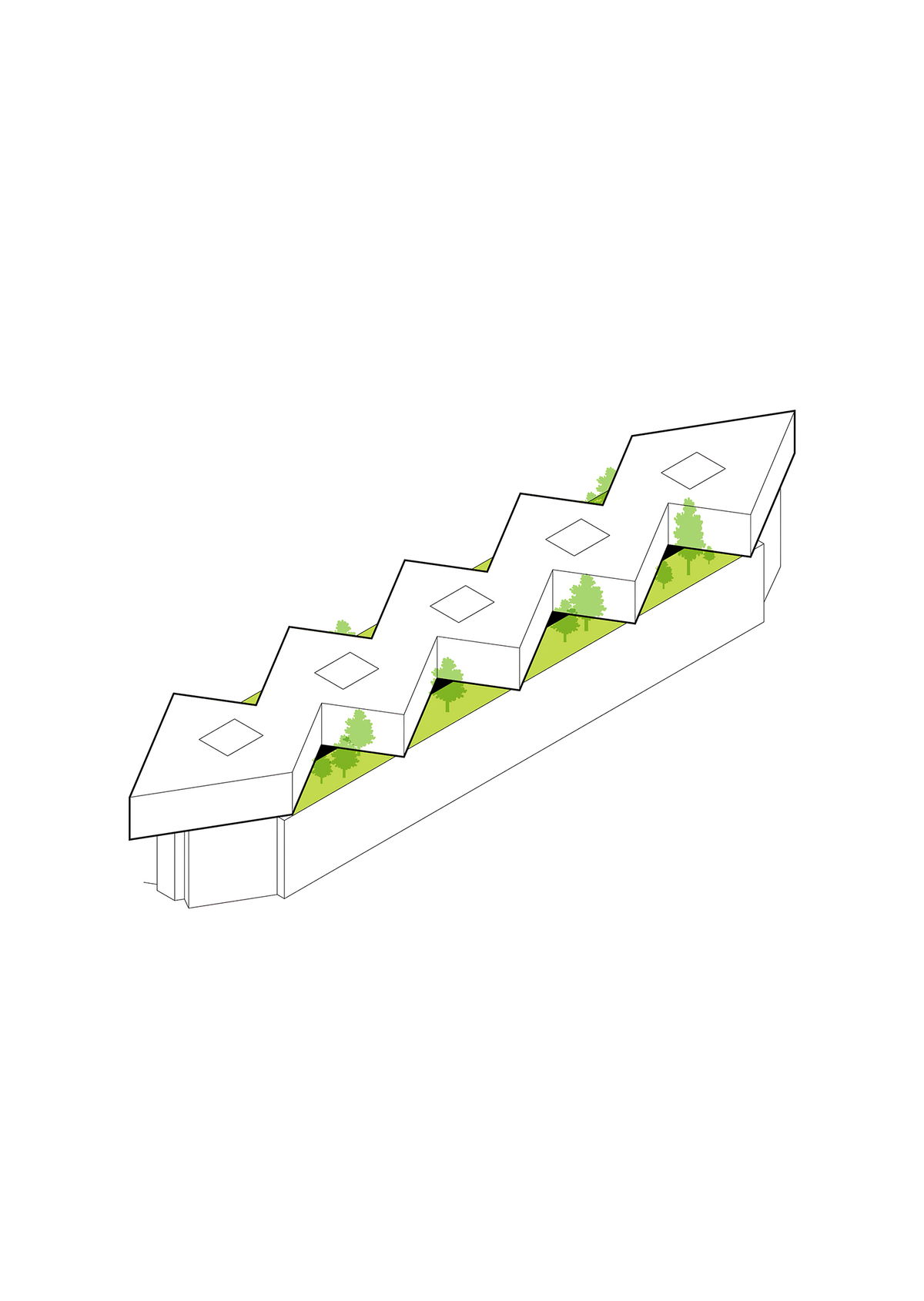 Grid — The rotated volumes are matched to the existing column grid, creating an economical structural system.