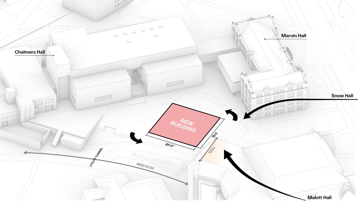 CONSOLIDATE + ROTATE — Architecture and design studios and classrooms are consolidated into Marvin Hall, Chalmers Hall and the Makers' KUbe. The KUbe is rotated to align with Wescoe Drive and surrounding buildings.