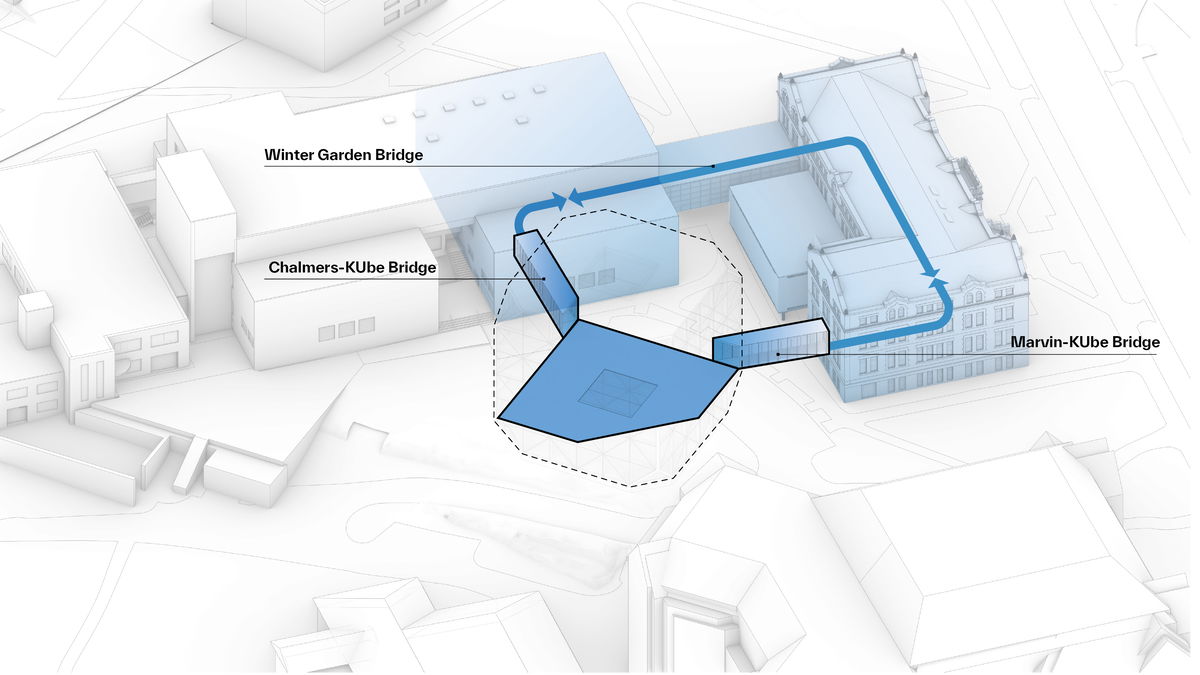 CONTINUOUS CIRCULATION LOOP — The KUbe connects to Chalmers Hall and Marvin Hall on the second floor via the revitalized Winter Garden bridges, creating a continuous loop between the three buildings.