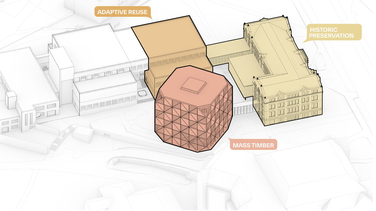 SUSTAINABILITY SHOWCASE — Three strategies for sustainable architecture are showcased, including preserving and updating Marvin Hall; extending the life and livability of Chalmers Hall with minimal intervention; and building a new mass timber, low-carbon structure.