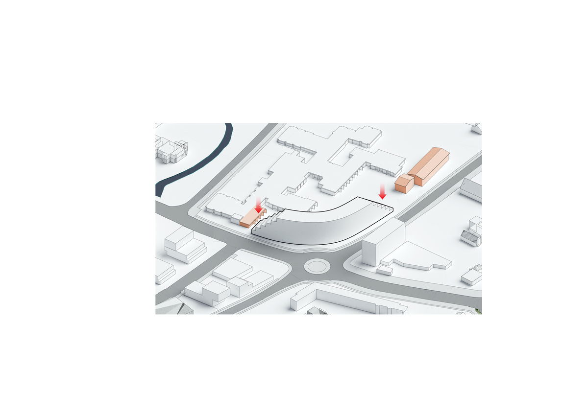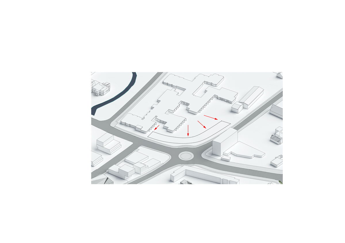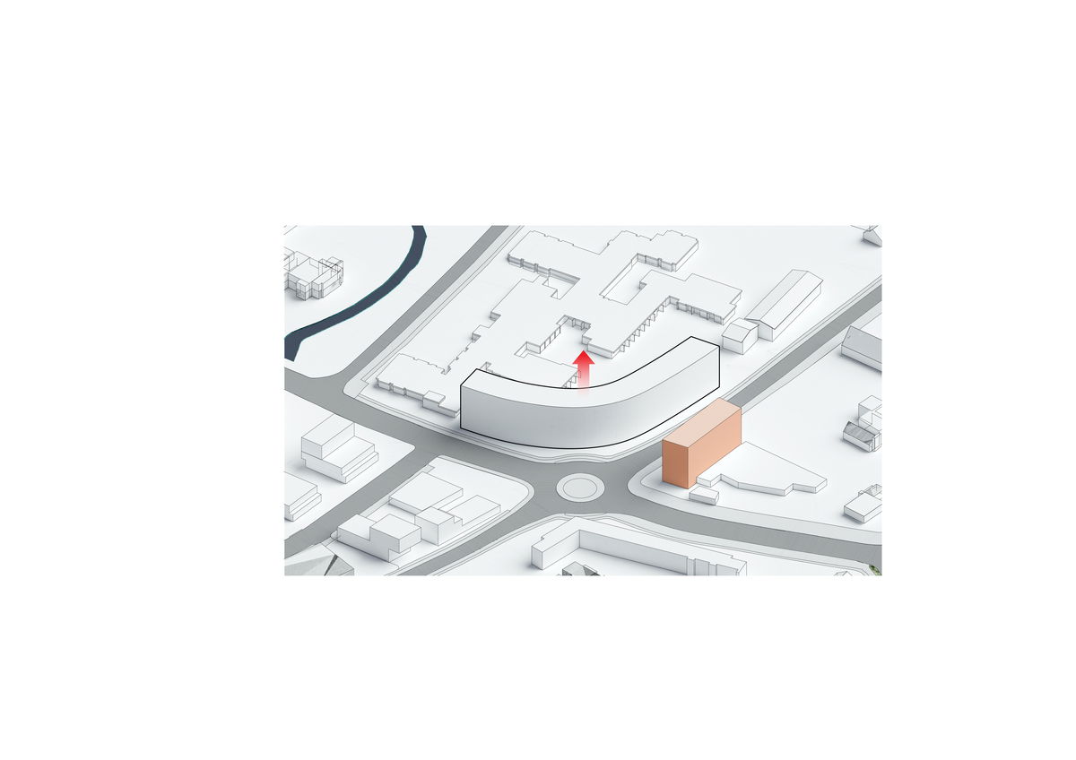 STREET ADJUSTMENT — The building follows the street peripheries and maintains a respectful distance to neighboring buildings.