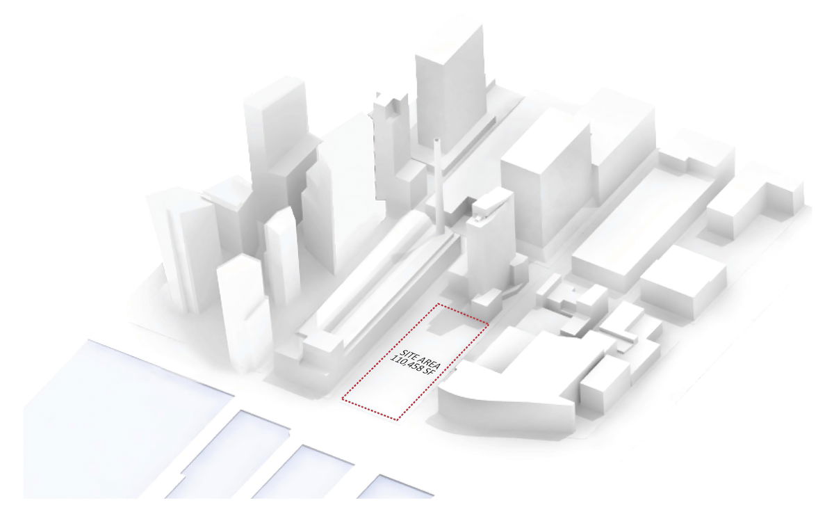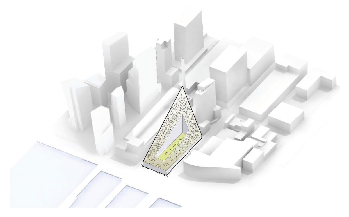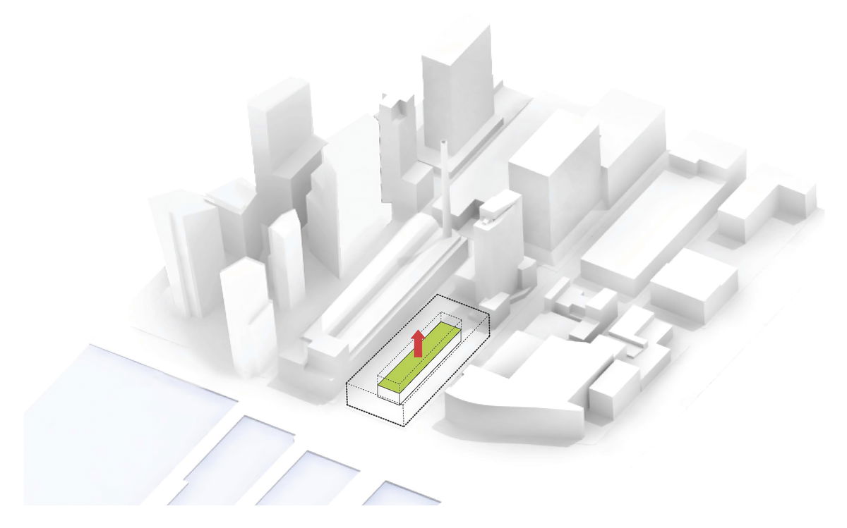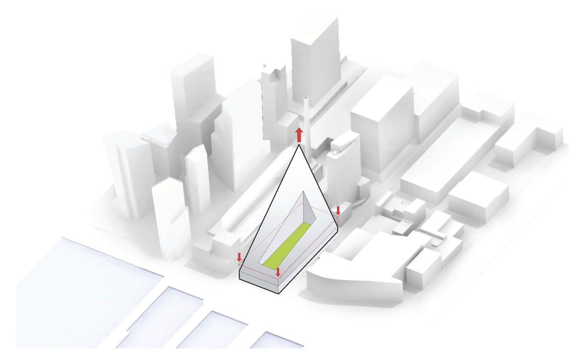 DENSIFICATION — To reach Manhattan density, the north-east corner is raised to 470 ft.