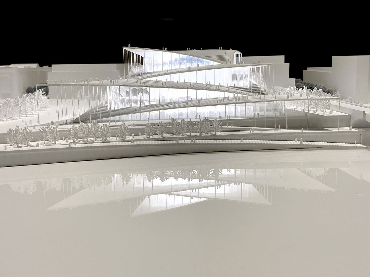 RIVER TO ROOF — From this rational volume, colonnades crescendo into a powerful expression ascending from river to roof.