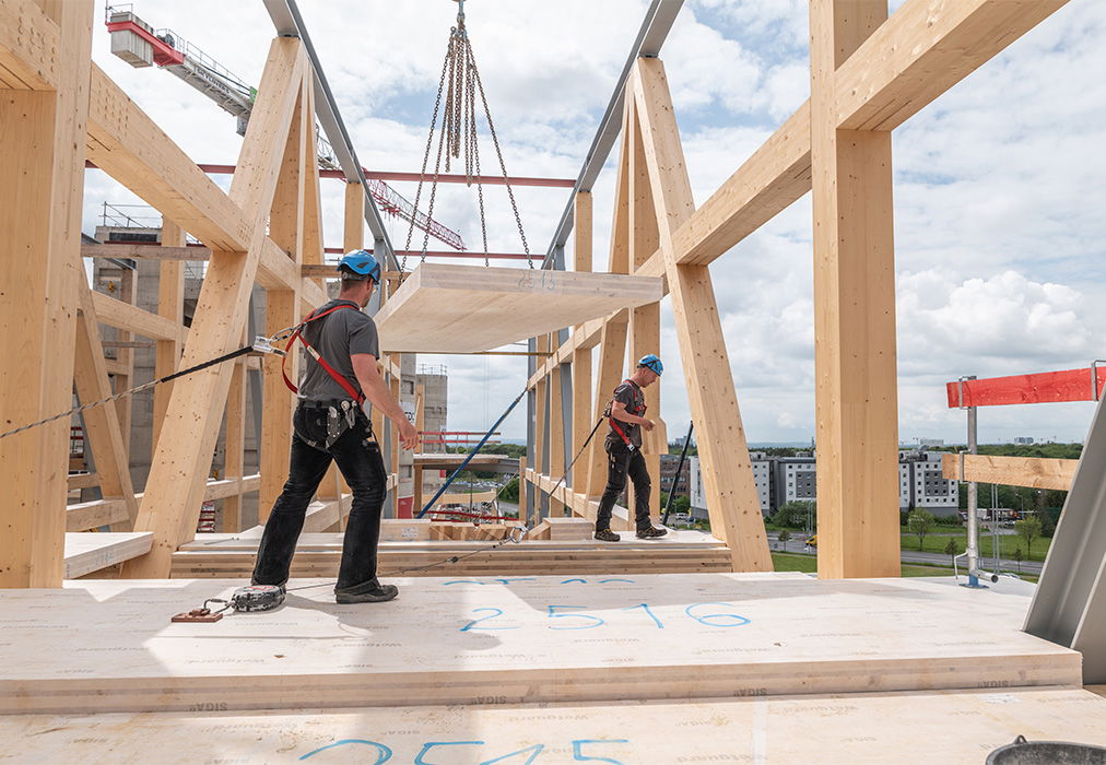 The Plus is the first factory building in the world that meets the BREEAM Outstanding certification’s strict environmental requirements for safe, healthy, and good physical working environments. Constructed in just 18 months, the 7,000 m² production facility is made of local PEFC-certified cross-laminated timber (CLT) and glued-laminated timber (glulam), low-carbon concrete, and recycled steel.