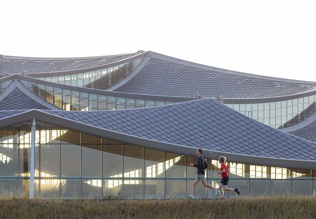 On the exterior, the buildings feature a first-of-its-kind “dragonscale” solar skin roof equipped with 50,000 silver solar panels that generate a total of nearly four megawatts of energy, approximately 40% of the buildings’ annual energy use.