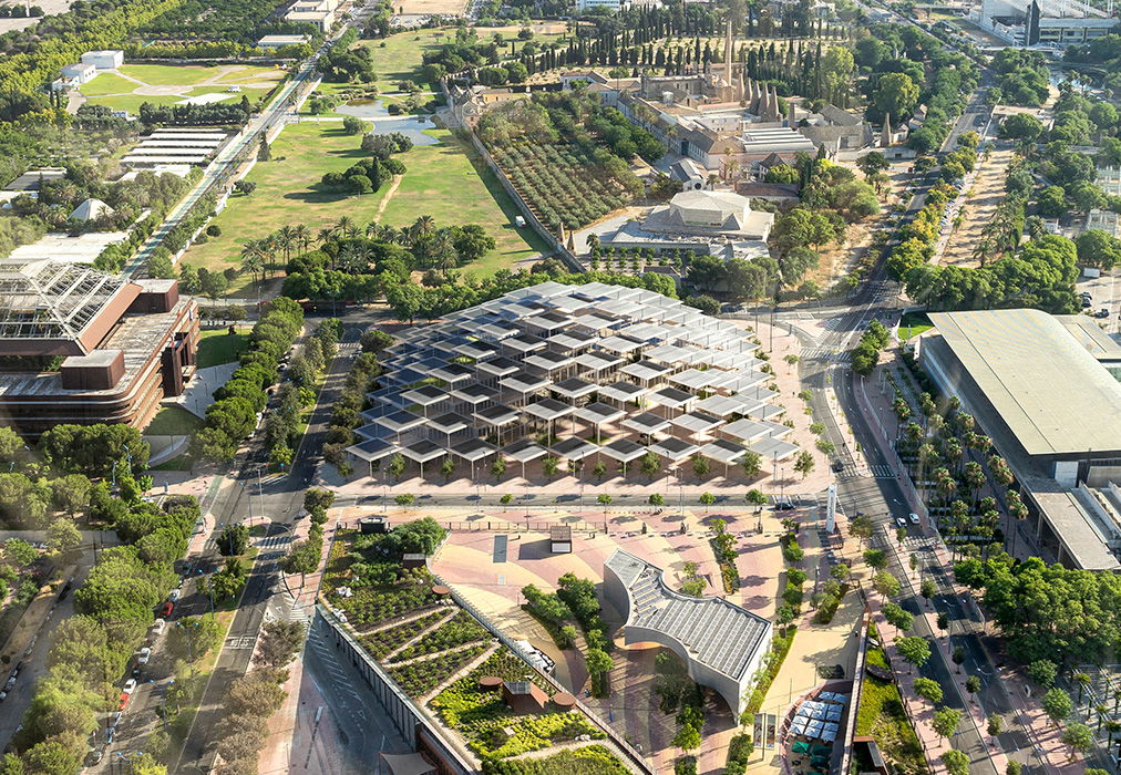 Informed by the shaded plazas and streets of Seville, BIG proposes to cover the entire project site with a cloud of solar canopies sheltering the plaza, garden, and research building underneath, akin to the pergolas typical to Seville. The canopies consist of square lightweight PV sheets supported by slender columns. The roofscape cascades down from the center to a human-scale height at its periphery, creating a variety of public spaces underneath.